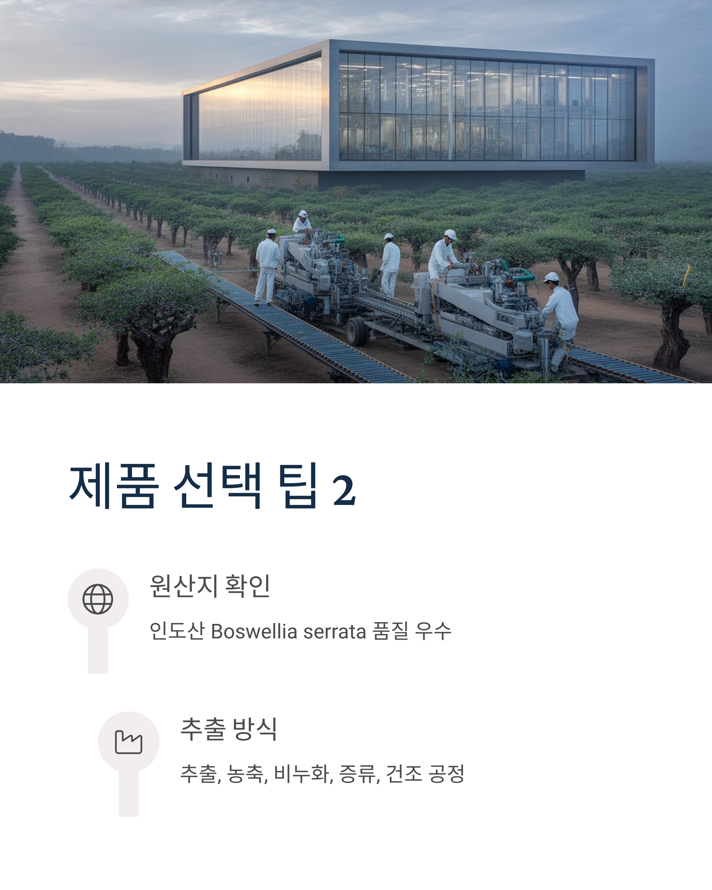 - 원산지 확인: 인도산 Boswellia serrata가 품질이 우수함