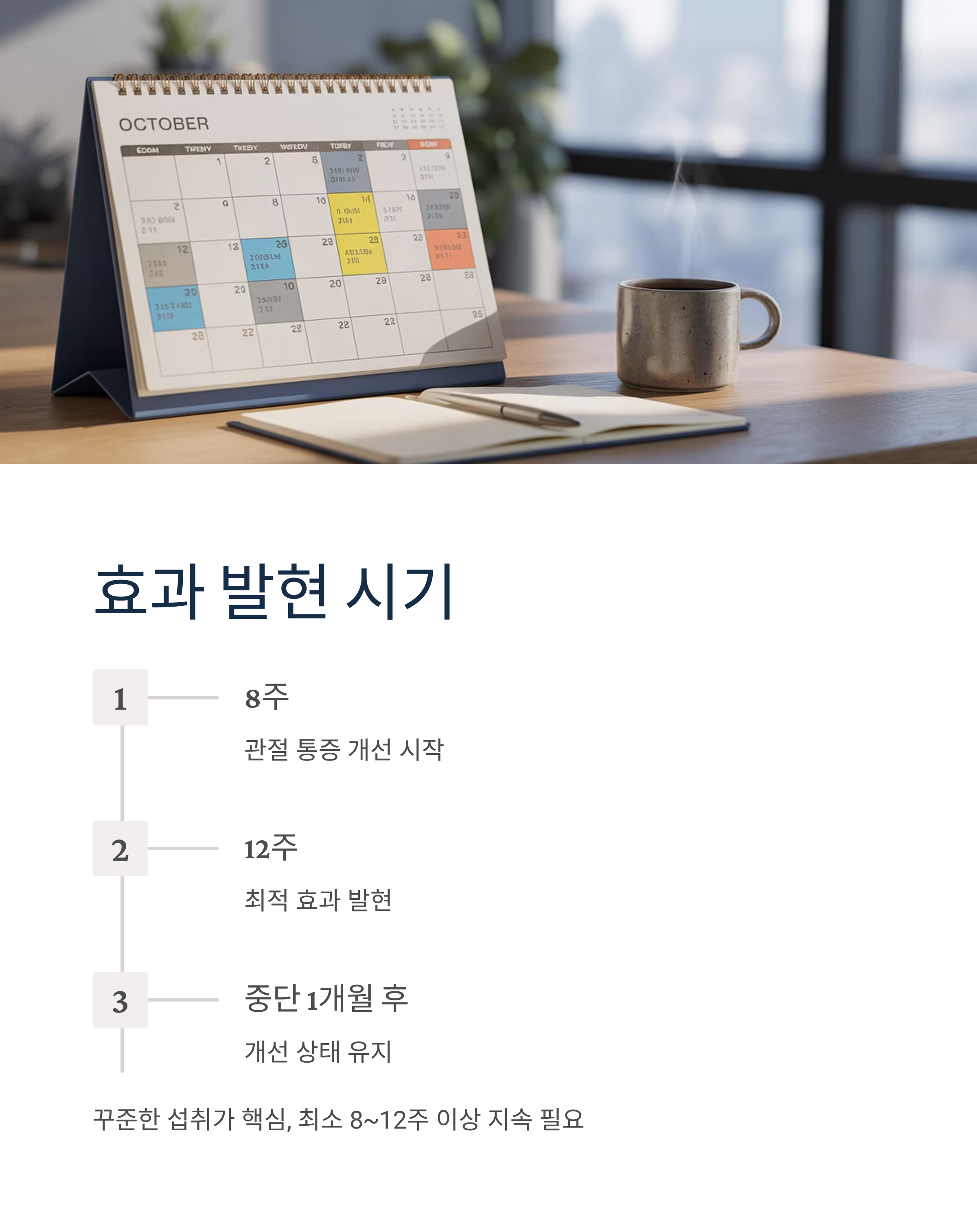 다만 효과를 보기 위해서는 최소 8~12주 이상 꾸준히 섭취해야 하며, 하루 권장량을 지키고 부작용에 주의해야 합니다. 관절 통증이 심하거나 기저질환이 있다면 전문의와 상담 후 섭취하시기 바랍니다.