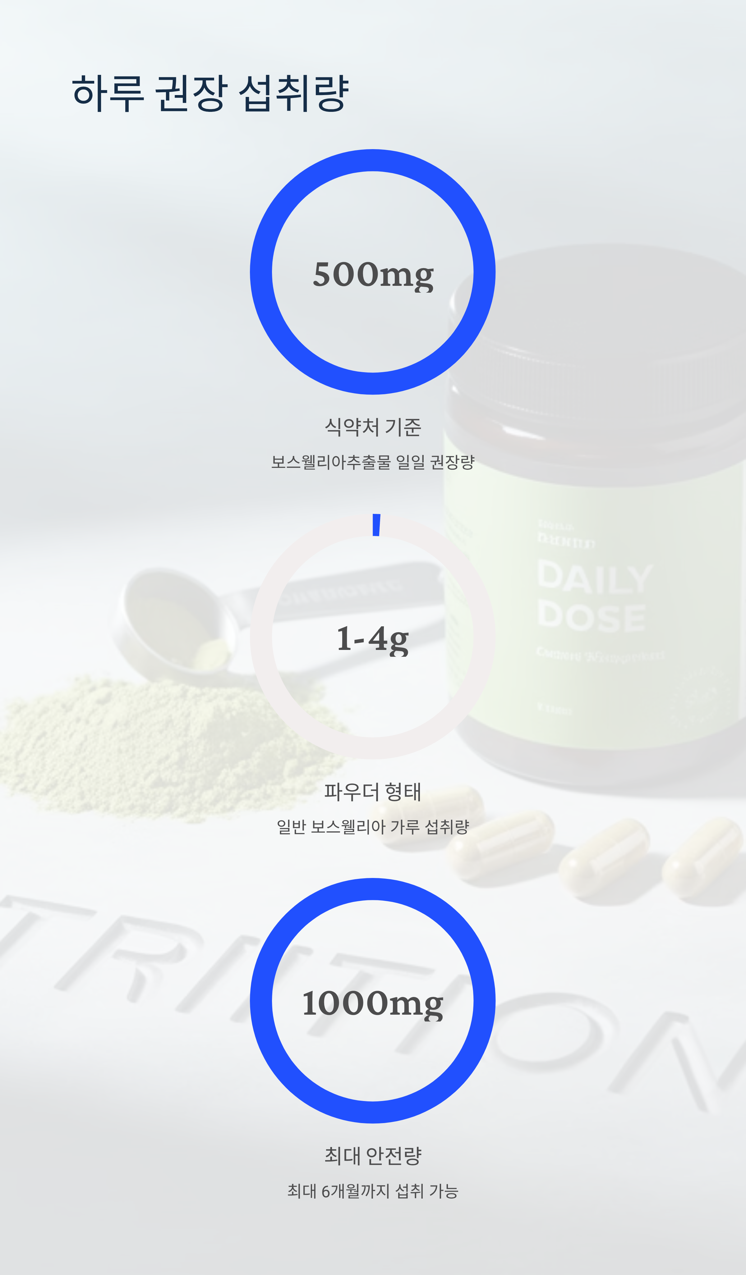 - 일반 보스웰리아 파우더: 1~4g/일 (4g 이하 권장)