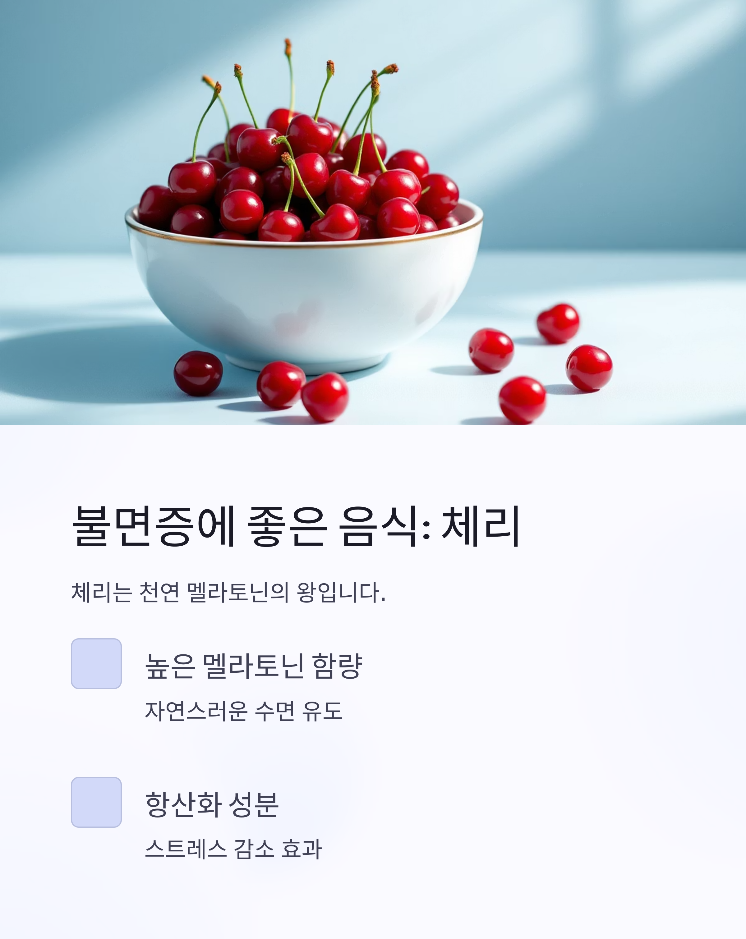 체리는 천연 멜라토닌 함량이 매우 높은 과일입니다. 신선한 체리나 무가당 건체리를 잠자기 전 소량 섭취하면 수면 유도에 큰 도움이 됩니다.
