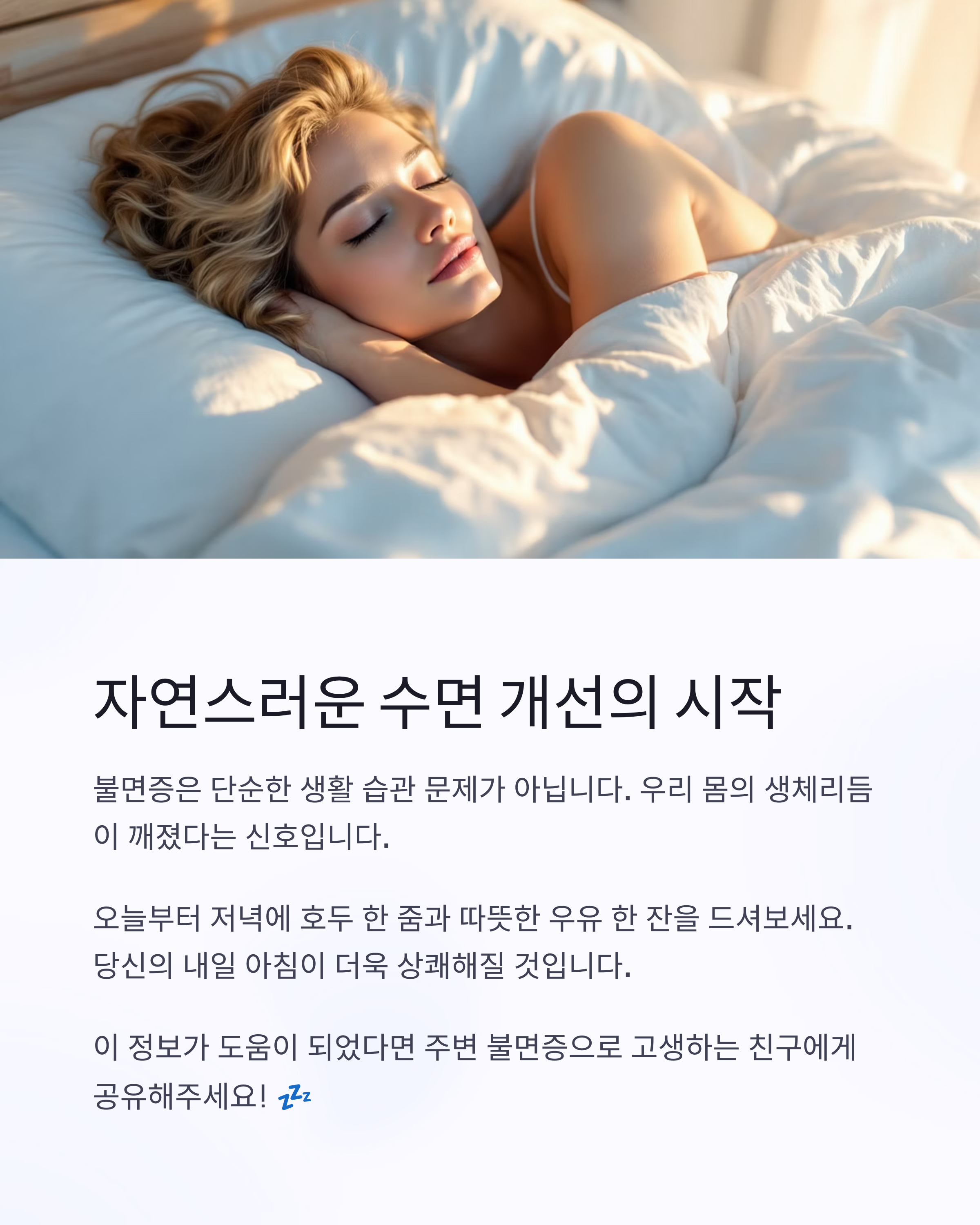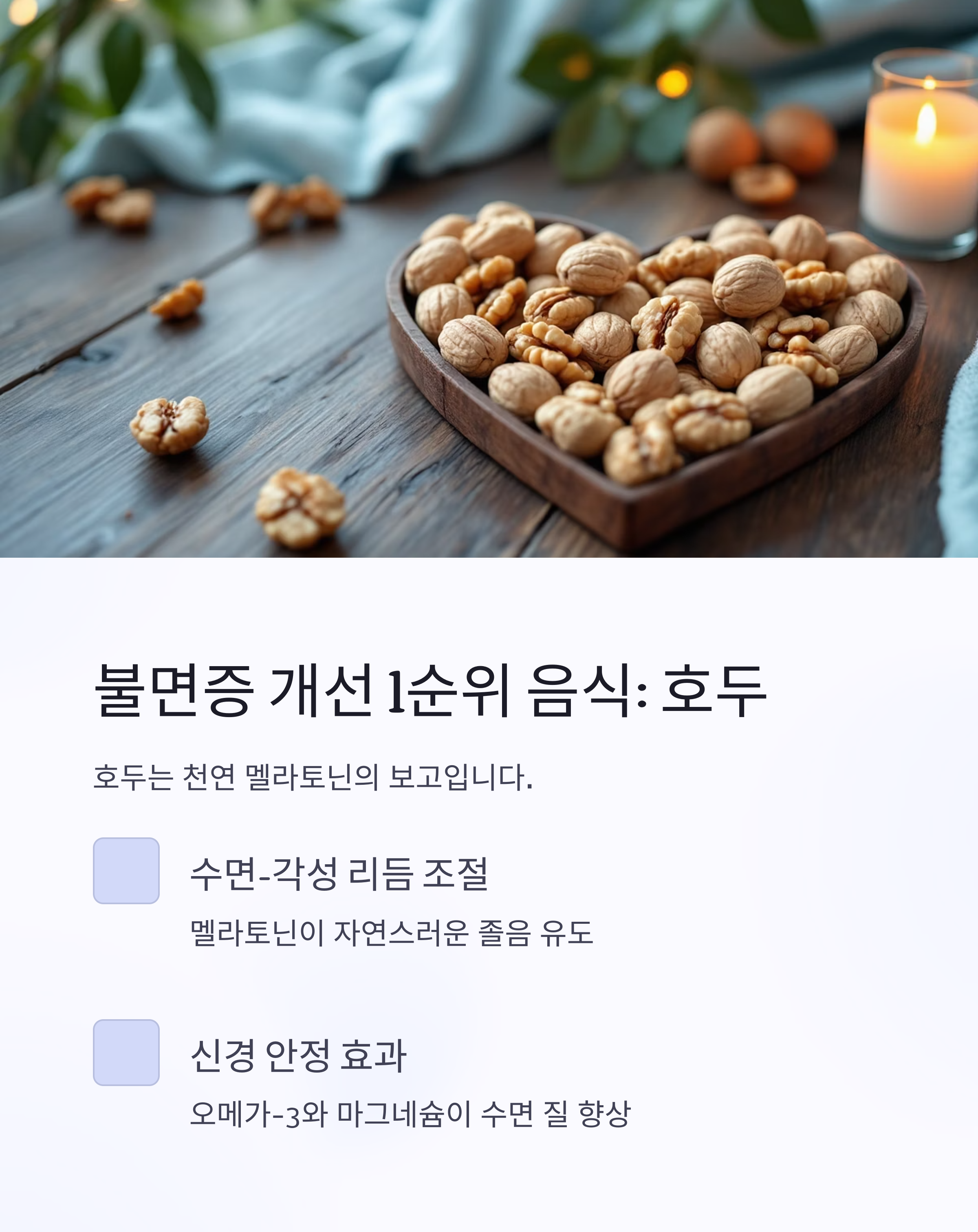 특히 호두는 과학적으로 검증된 대표적인 수면 유도 식품입니다. 오늘부터 저녁에 호두 한 줌과 따뜻한 우유 한 잔을 드셔보세요. 당신의 내일 아침이 더욱 상쾌해질 것입니다.