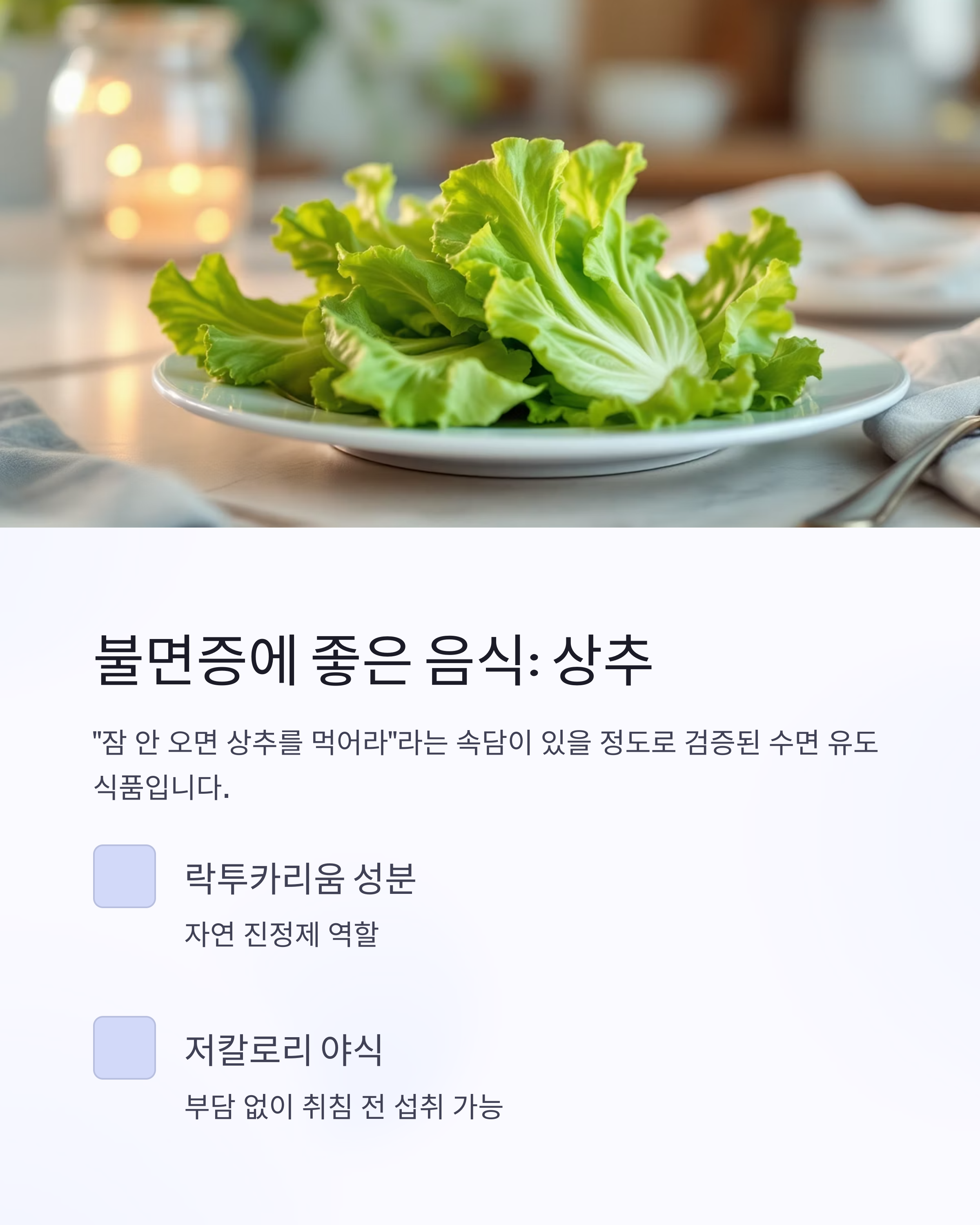 상추의 락투카리움 성분은 자연 진정제 역할을 합니다. 예로부터 "잠 안 오면 상추를 먹어라"는 말이 있을 정도로 검증된 수면 유도 식품입니다.
