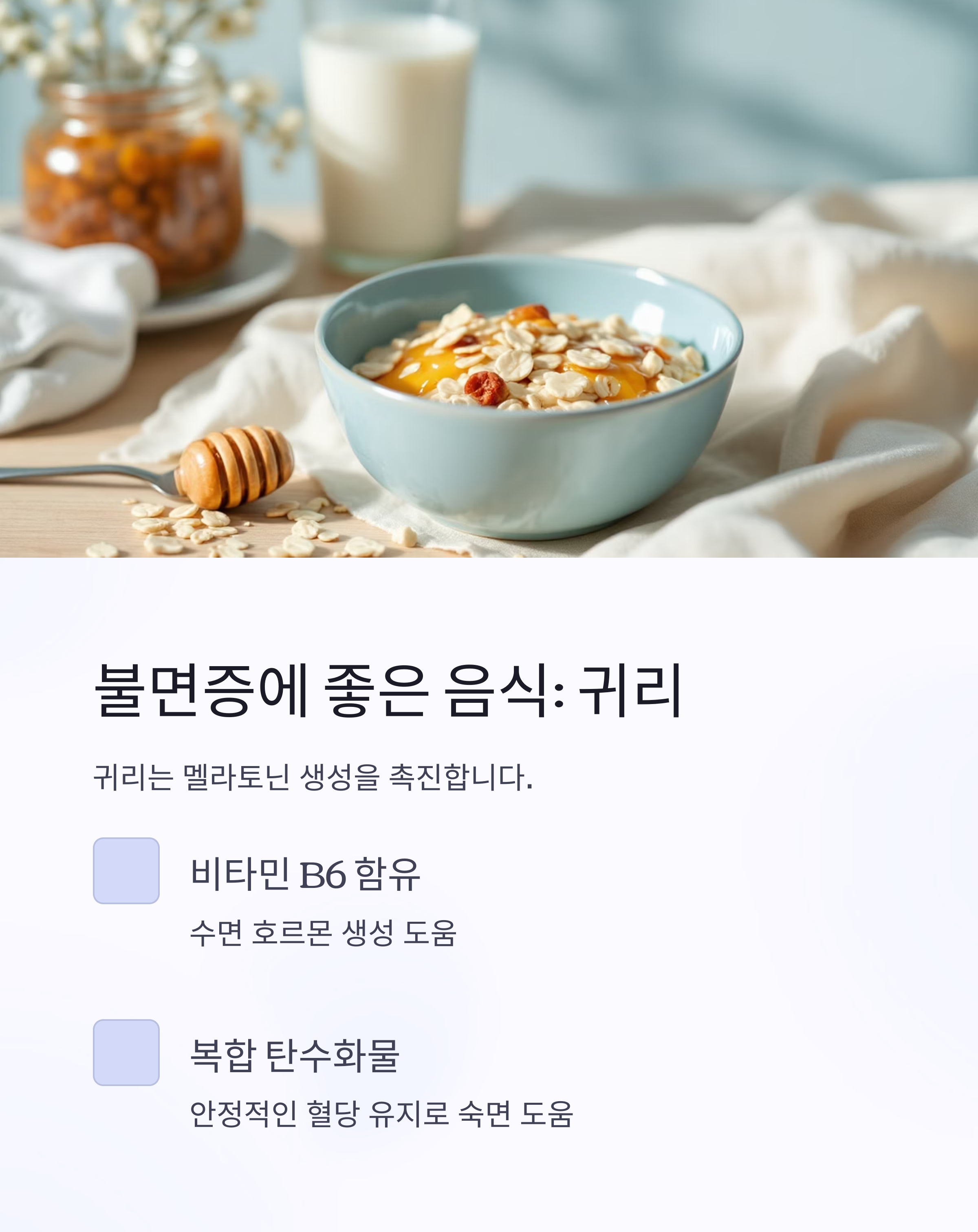 귀리에는 비타민 B6와 복합 탄수화물이 많아 수면 호르몬 생성을 도와줍니다. 우유나 두유와 함께 끓여 먹으면 더욱 효과적입니다.
