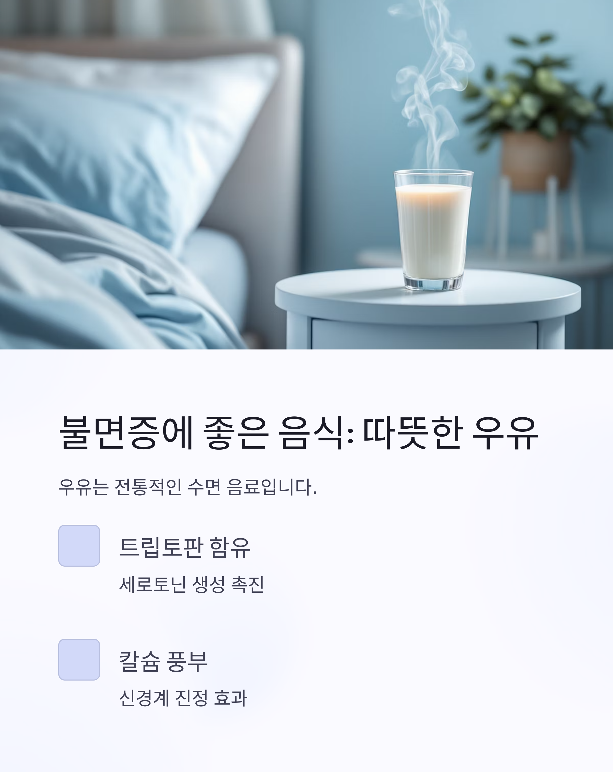 우유의 트립토판과 칼슘이 신경계를 진정시켜 자연스러운 졸음을 유도합니다. 호두와 함께 먹으면 시너지 효과를 볼 수 있습니다.