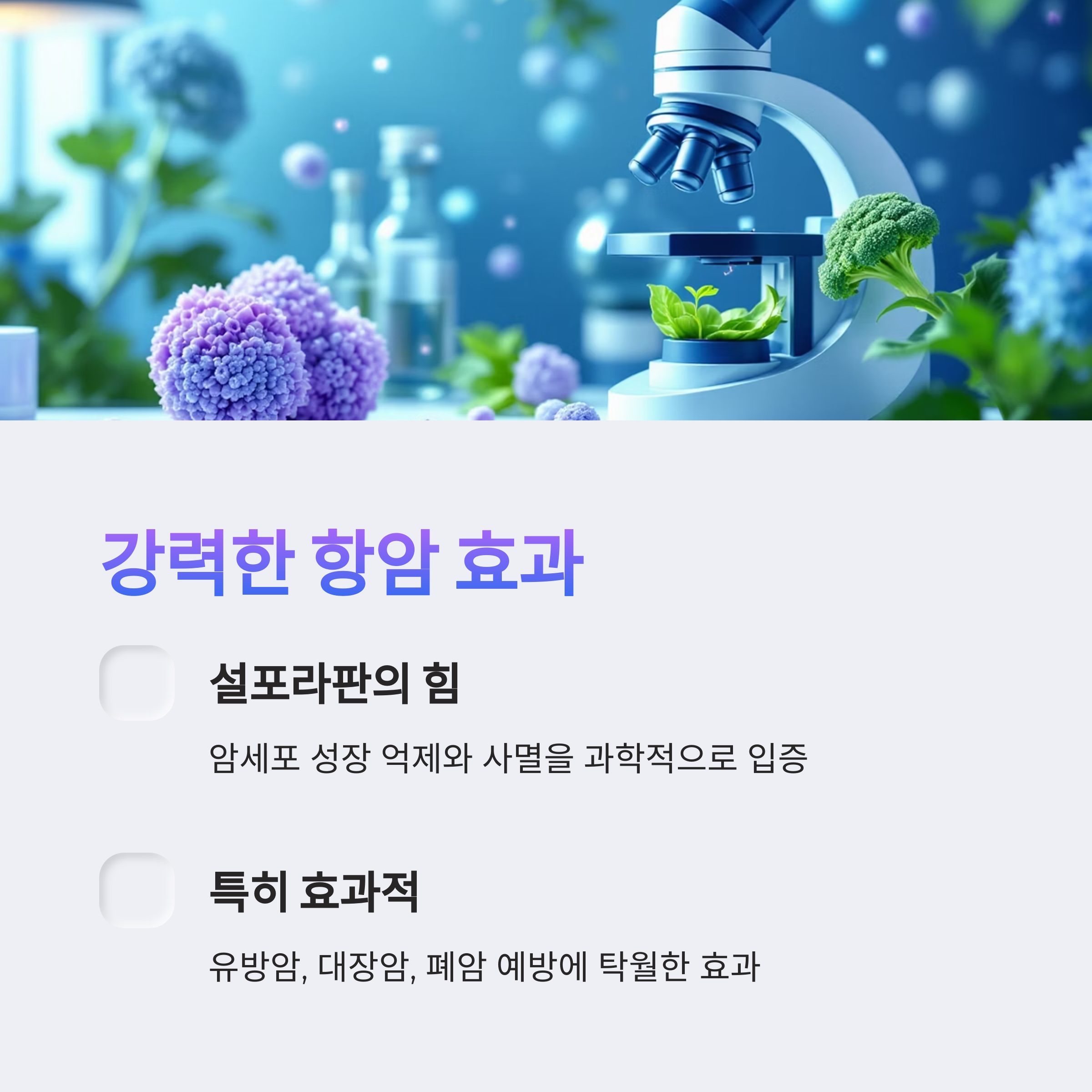 브로콜리의 대표 성분인 설포라판은 암세포 성장 억제와 사멸을 유도하는 것으로 과학적으로 입증되었습니다. 특히 유방암, 대장암, 폐암 예방에 탁월한 효과를 보입니다.