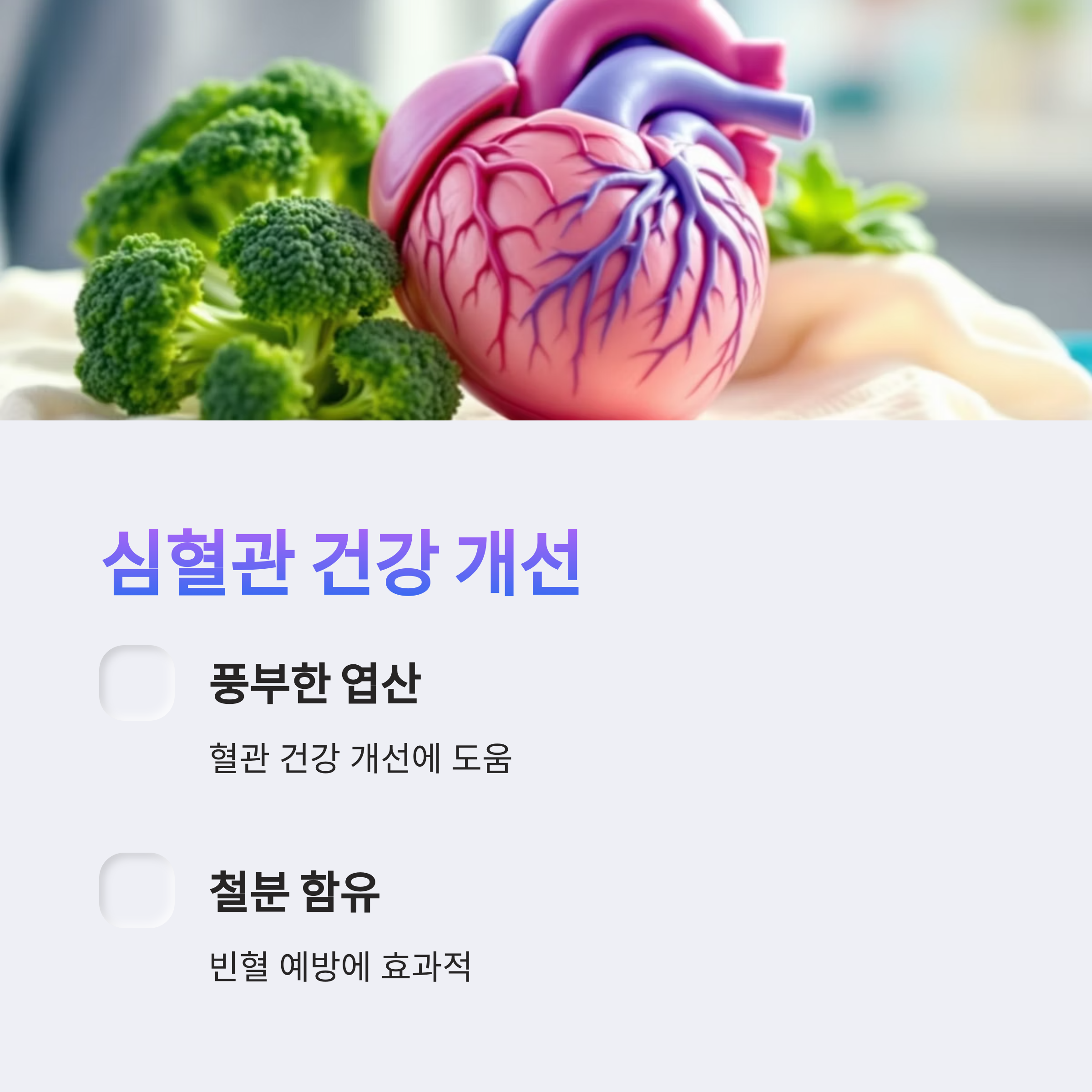 풍부한 엽산과 철분이 혈관 건강을 개선하고 빈혈 예방에 도움을 줍니다.
