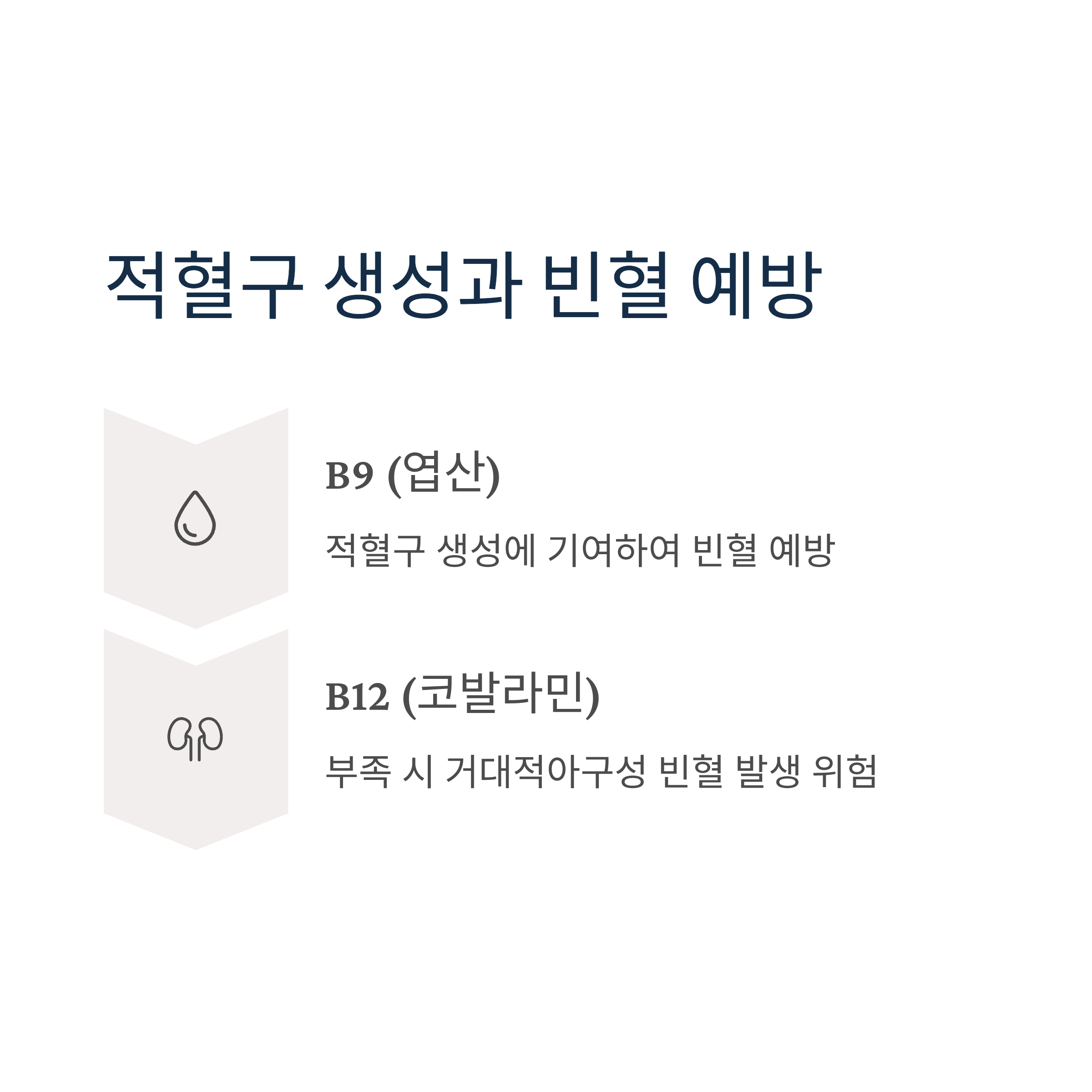 비타민 B9(엽산)과 B12는 적혈구 생성에 기여해 빈혈을 예방합니다. 특히 B12가 부족하면 거대적아구성 빈혈이 발생할 수 있습니다.
