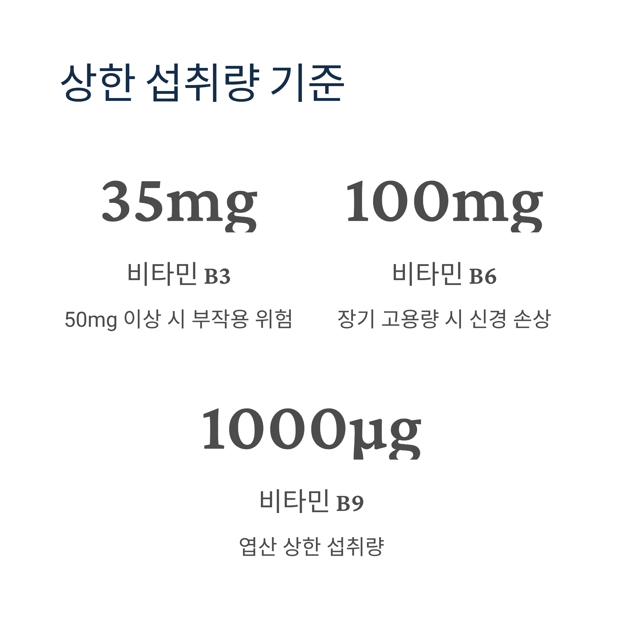 - 비타민 B6: 100mg (장기 고용량 복용 시 신경 손상)