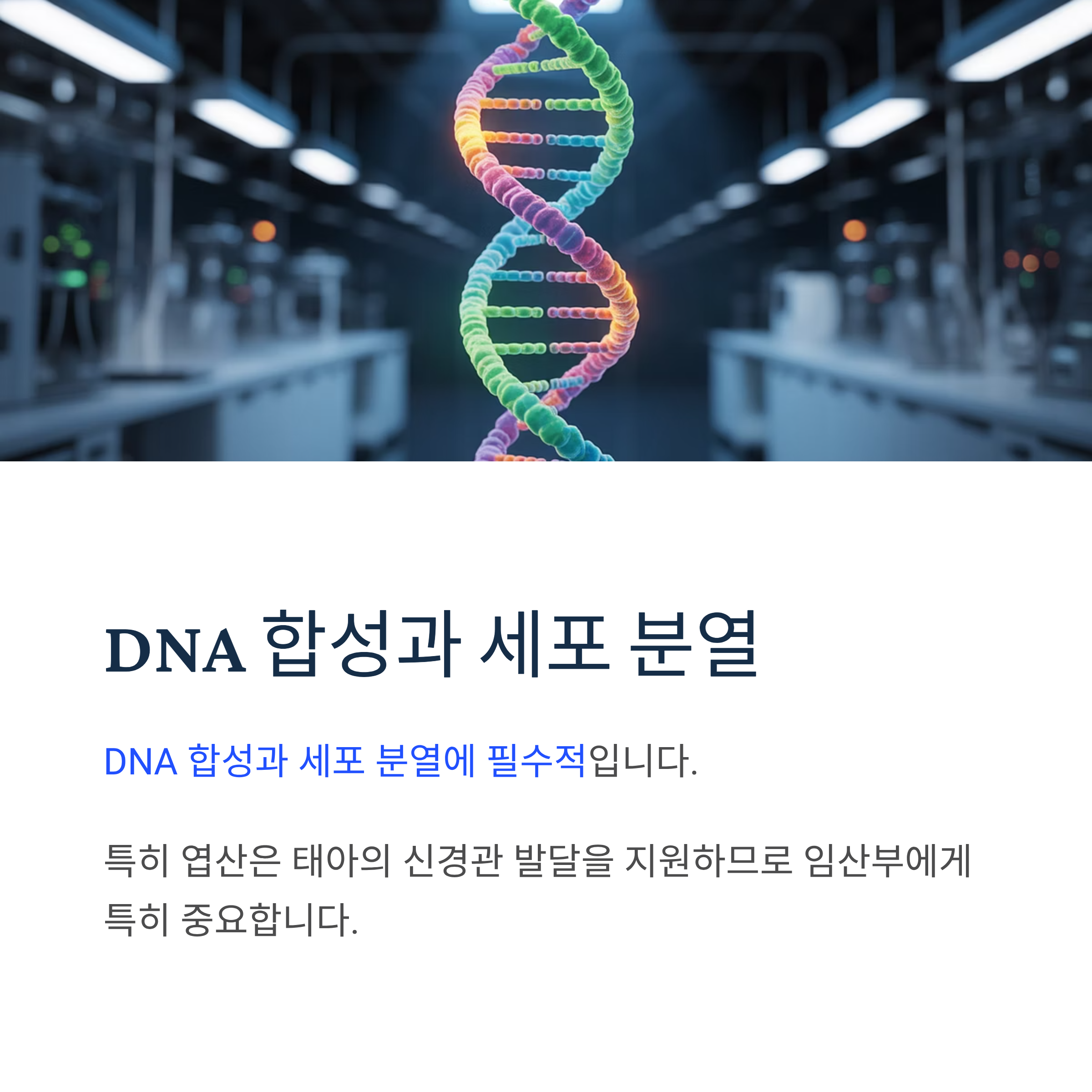 DNA 합성과 세포 분열에 필수적입니다. 특히 엽산은 태아의 신경관 발달을 지원하므로 임산부에게 특히 중요합니다.