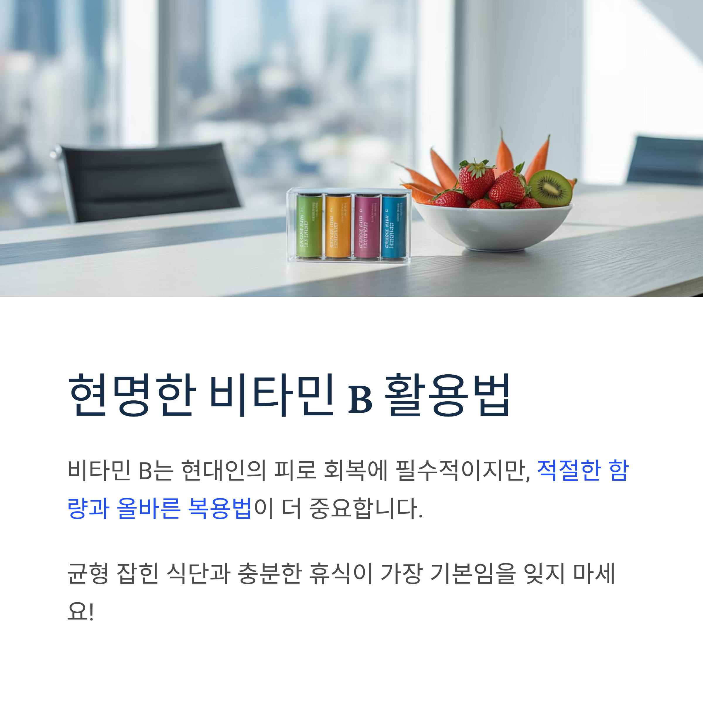 건강한 에너지 대사와 활력 넘치는 일상을 위해 비타민 B를 현명하게 활용해보세요. 단, 영양제는 보조 수단일 뿐 균형 잡힌 식단과 충분한 휴식이 가장 기본임을 잊지 마시기 바랍니다.