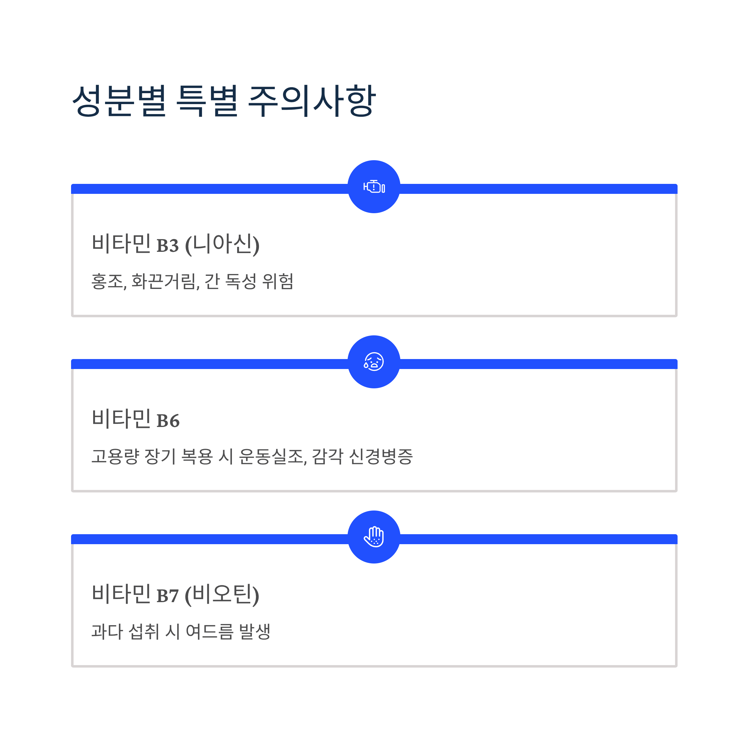 - 비타민 B3(니아신): 홍조, 화끈거림 (나이아신 플러시), 간 독성