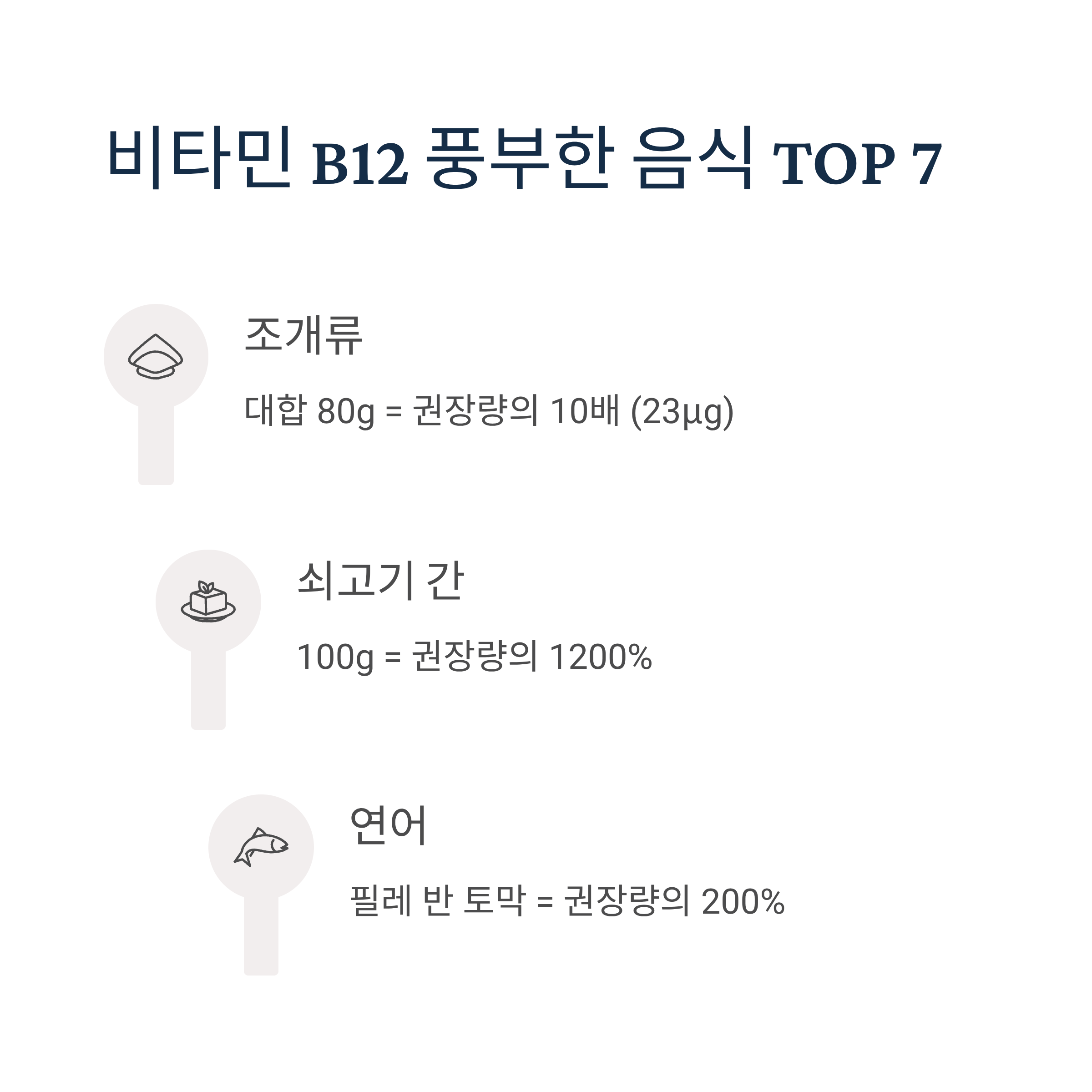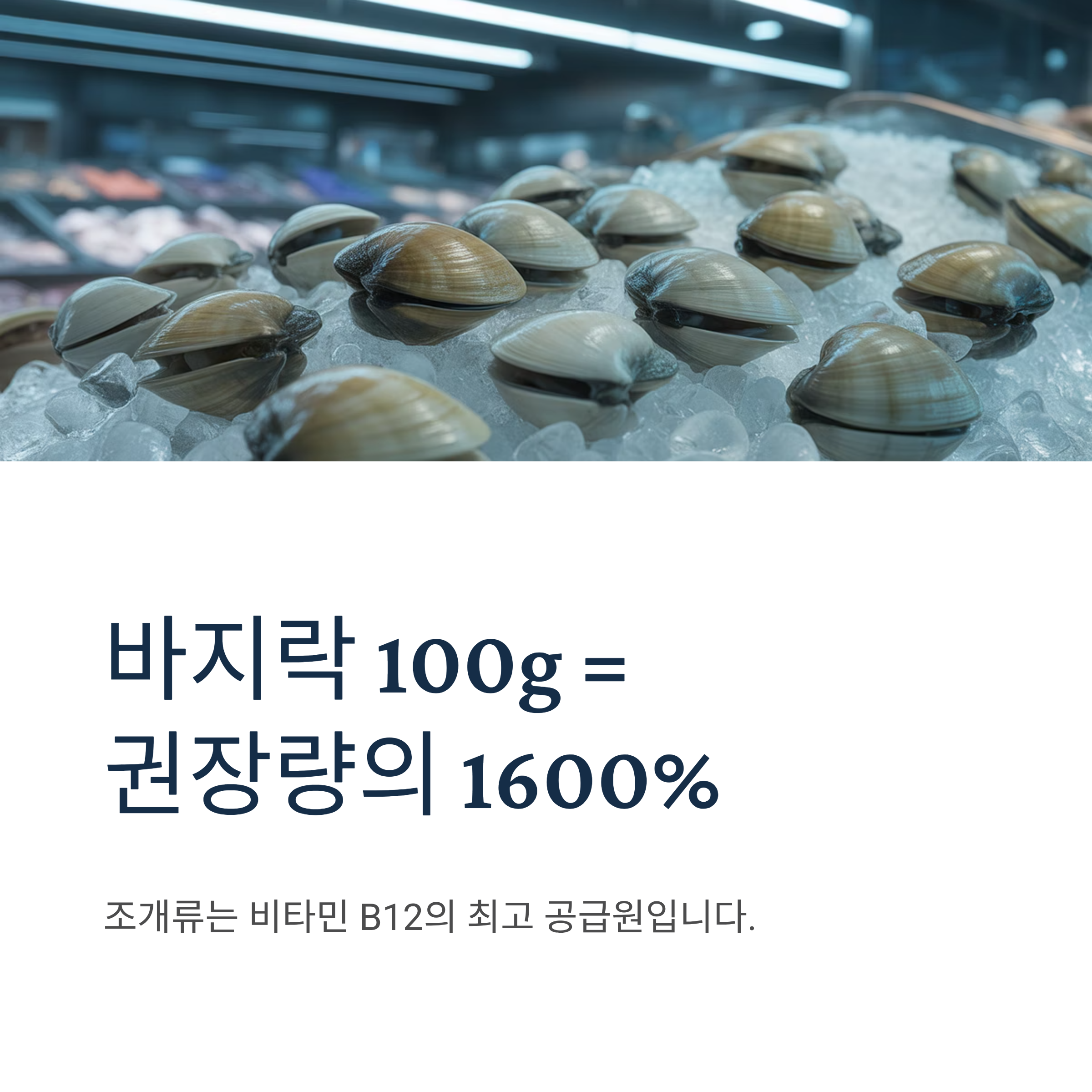 조개류가 단연 최고입니다. 대합 80g에는 권장량의 10배인 23μg이, 어린 조개도 일일 권장량의 40배 이상을 제공합니다. 바지락 100g에는 무려 권장량의 1600%가 들어있습니다.