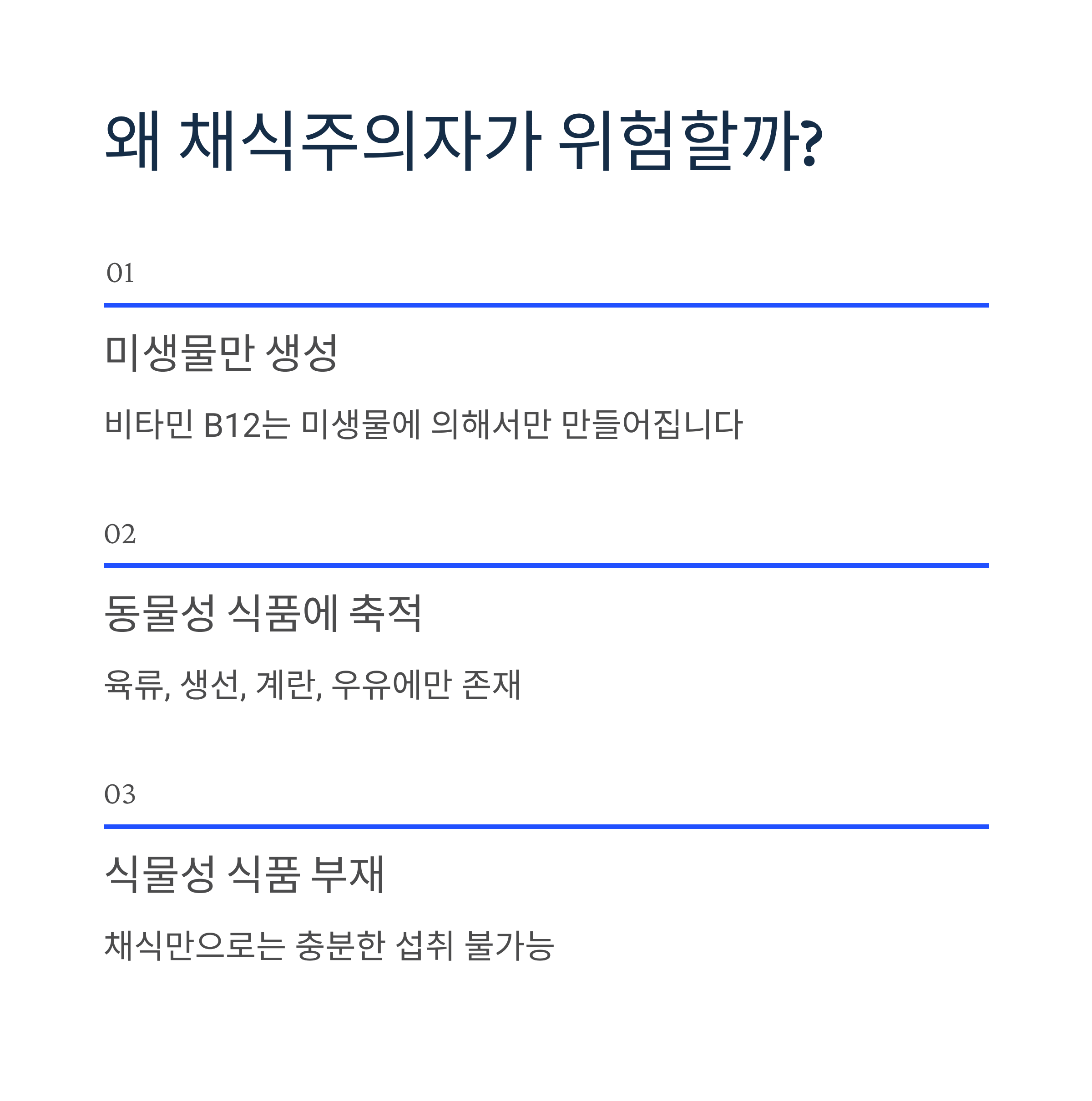 비타민 B12는 미생물에 의해서만 생성되며, 주로 동물성 식품에 축적됩니다. 육류, 생선, 계란, 우유 등 동물성 제품에서만 발견되기 때문에 채식주의자는 결핍 위험이 매우 높습니다. 연구에 따르면 락토-베지테리언(우유·유제품 섭취)과 락토-오보-베지테리언(우유·유제품·달걀 섭취)의 32%, 비건(완전 채식)의 43~90%가 비타민 B12 결핍 상태입니다.
