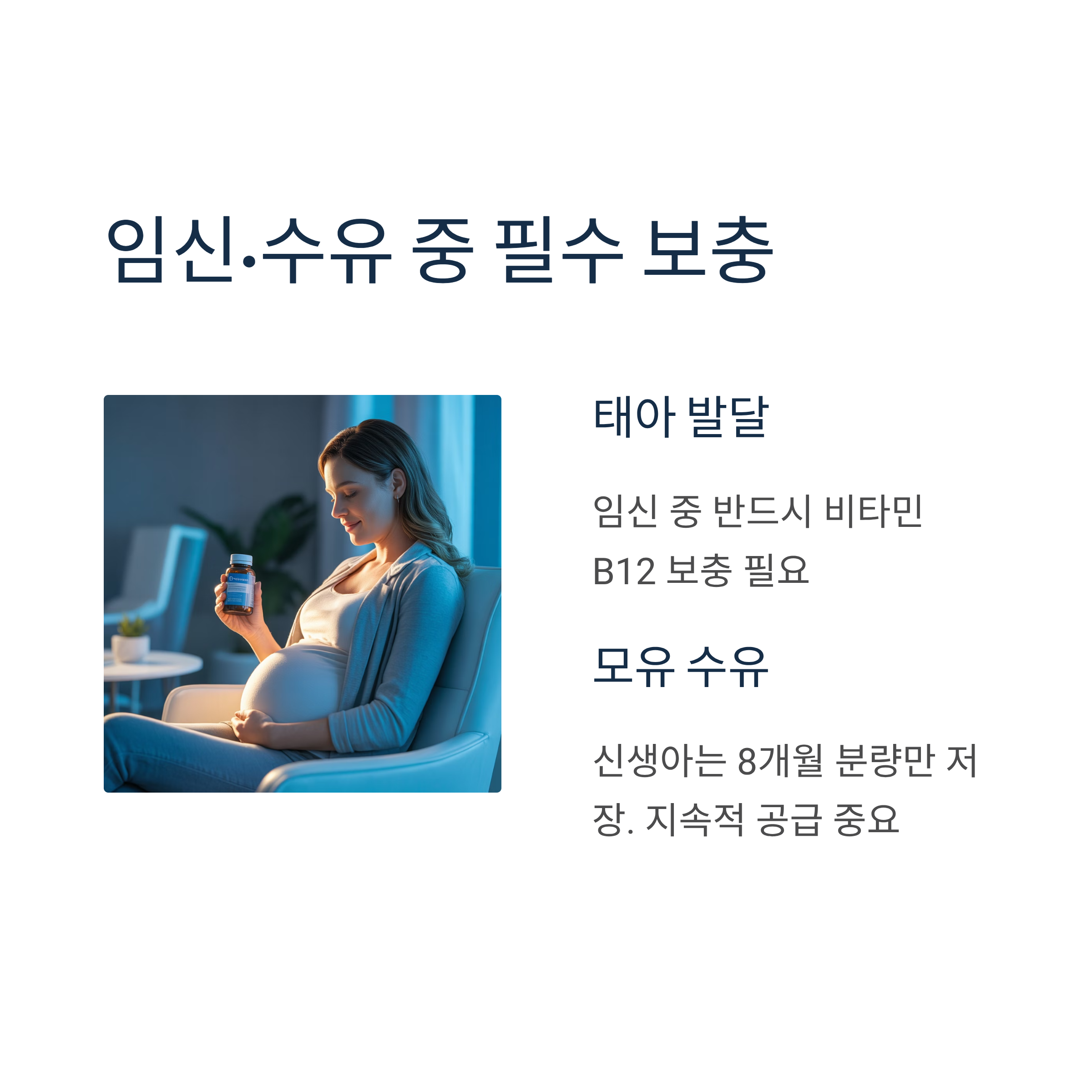 임신 중인 채식주의자는 태아의 발달을 위해 반드시 비타민 B12를 보충해야 하며, 모유 수유 중에도 지속적인 보충이 필요합니다. 신생아는 체내에 8개월 분량만 저장되어 있어 모유를 통한 충분한 공급이 중요합니다.
