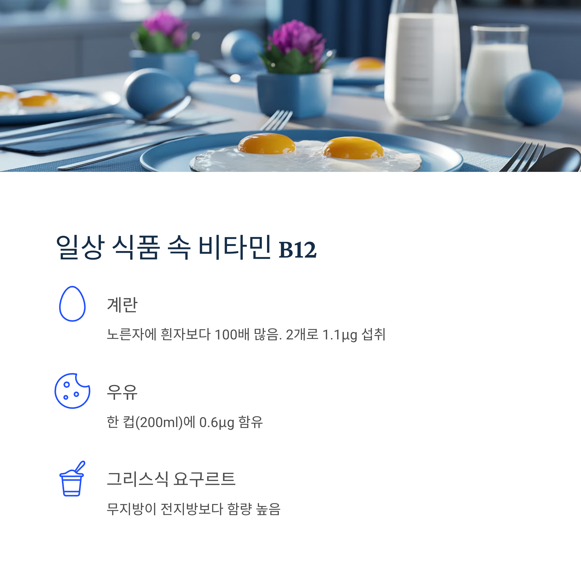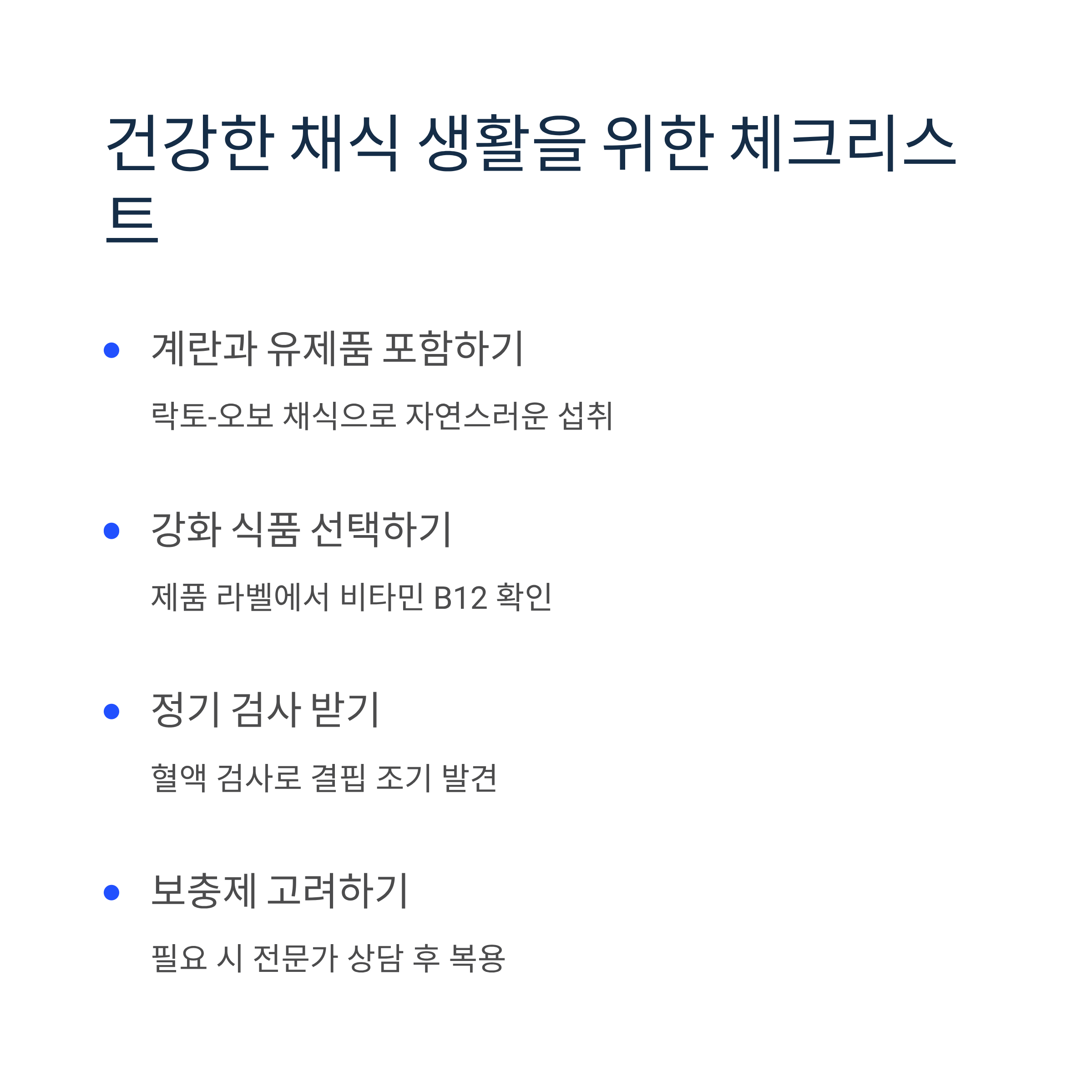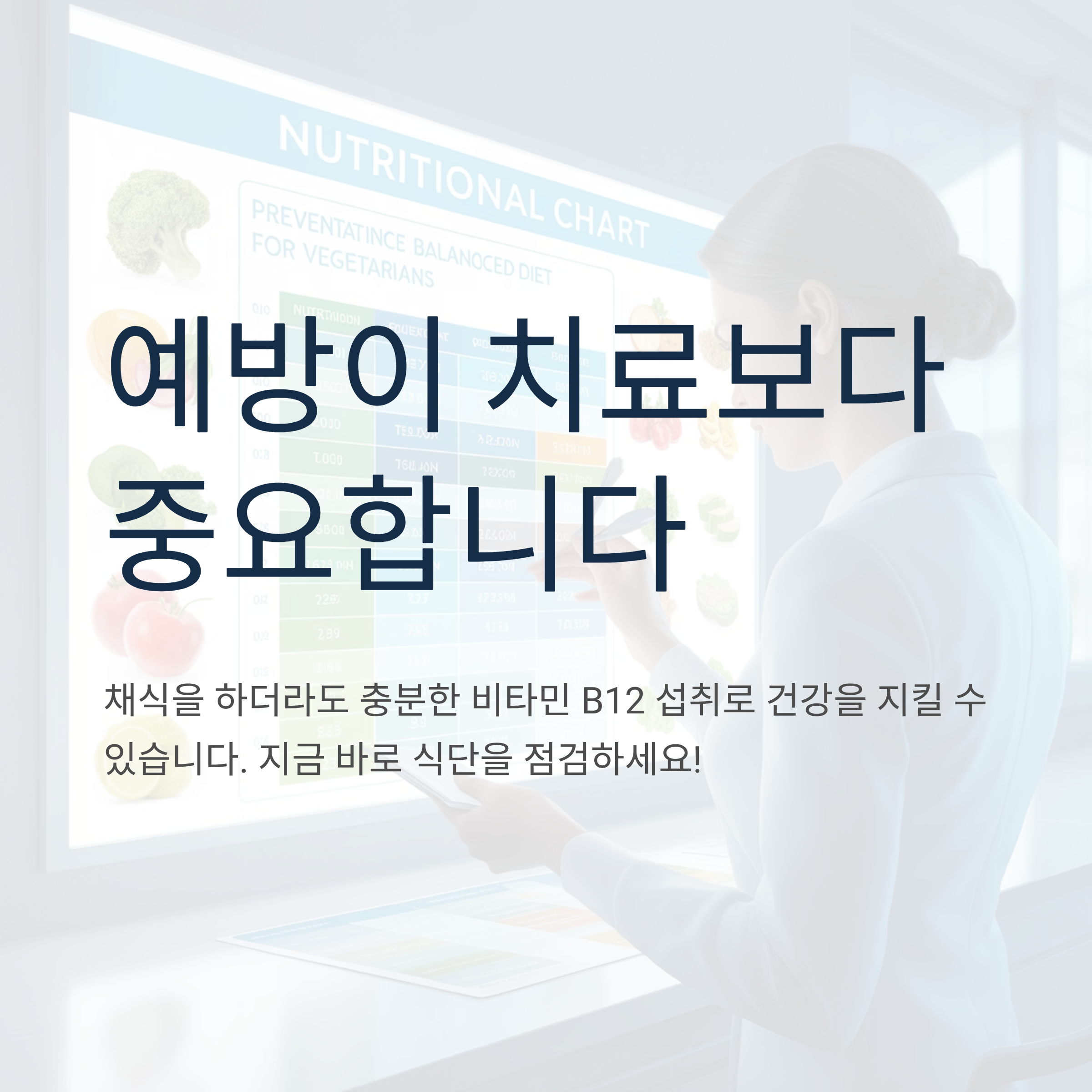 비타민 B12 결핍은 예방이 치료보다 중요합니다. 채식을 하더라도 계란과 유제품을 포함하거나, 강화 식품과 보충제로 충분히 건강을 지킬 수 있습니다.