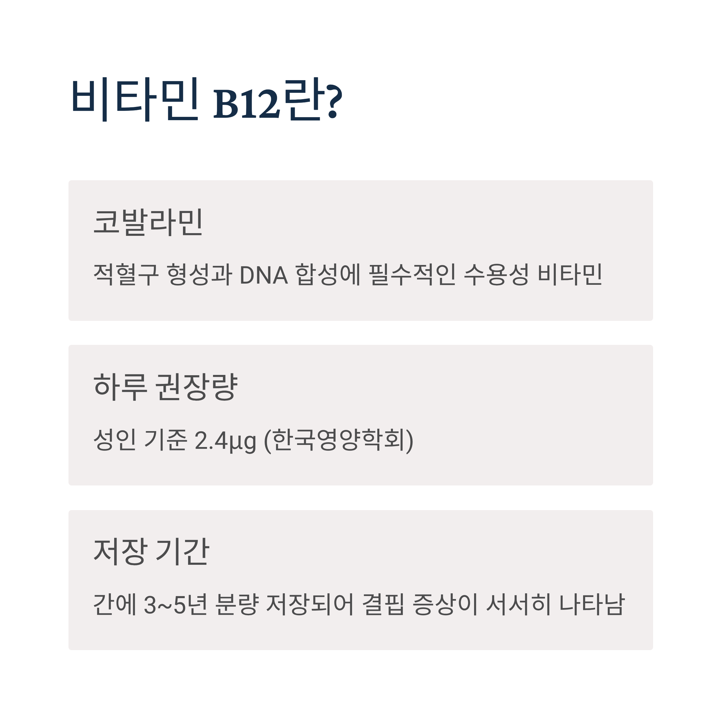 비타민 B12는 코발라민이라고도 불리며, 적혈구 형성과 DNA 합성, 신경계 정상 기능에 필수적인 수용성 비타민입니다. 한국영양학회는 성인 기준 하루 2.4μg 섭취를 권장하고 있으며, 다른 수용성 비타민과 달리 간에 3~5년 분량이 저장됩니다. 그래서 결핍 증상이 서서히 나타나 알아채기 어렵다는 특징이 있습니다.