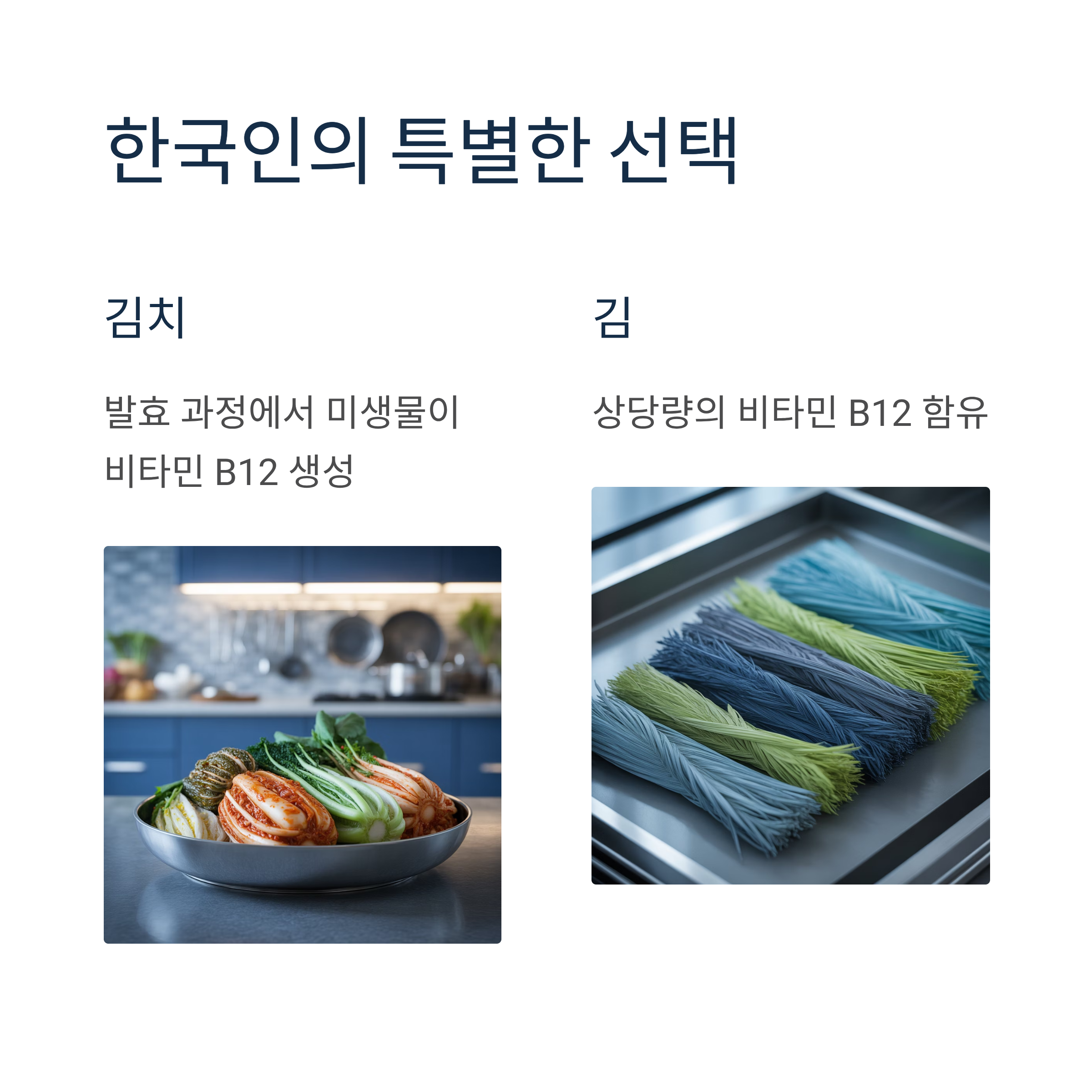 한국인이라면 김치와 김도 도움이 됩니다. 김치는 발효 과정에서 미생물에 의해 비타민 B12가 생성되며, 김 종류에도 상당량의 비타민 B12가 존재합니다. 다만 미역, 다시마, 클로렐라 같은 다른 해조류는 인간이 흡수할 수 없는 헛비타민 B12 형태로 존재해 오히려 흡수를 방해할 수 있으니 주의가 필요합니다.