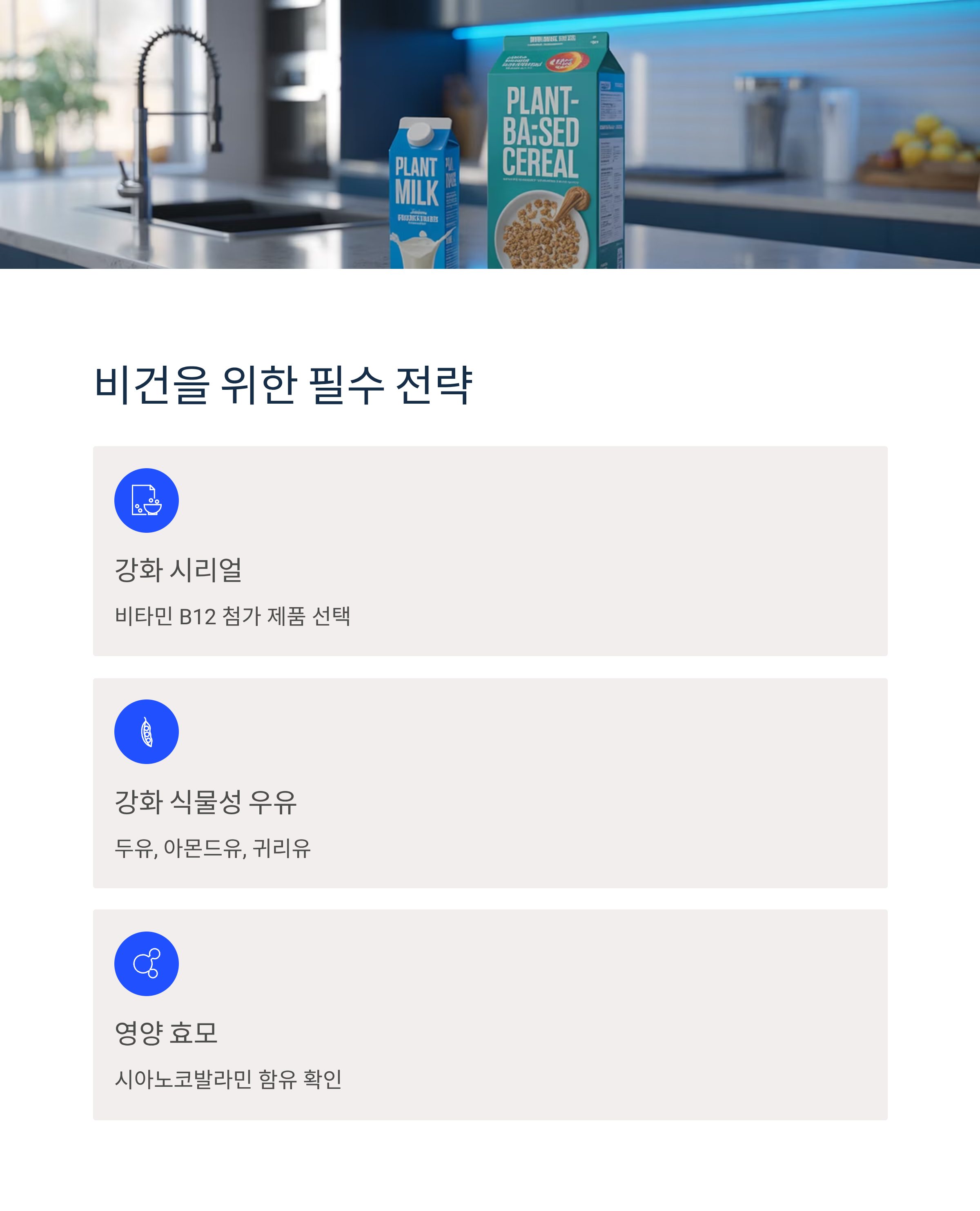 완전 채식을 하는 비건이라면 비타민 B12 강화 식품이 필수입니다. 강화 시리얼, 강화 두유, 강화 식물성 우유(아몬드유, 귀리유), 영양 효모 등을 선택하세요. 제품 라벨에서 "비타민 B12" 또는 "시아노코발라민"이 포함되어 있는지 반드시 확인해야 합니다.