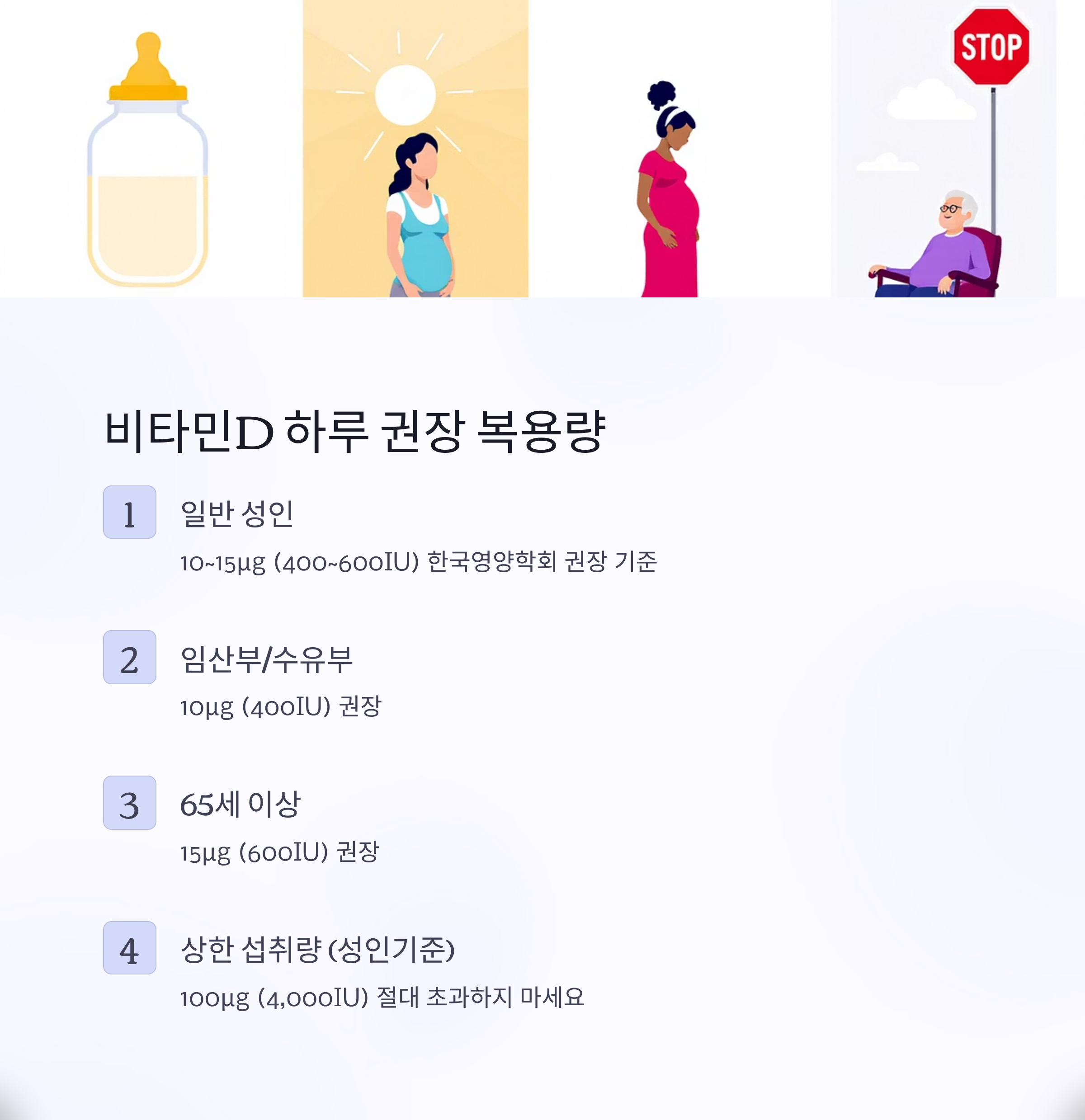 - 하루 권장량 준수 (400~600IU)