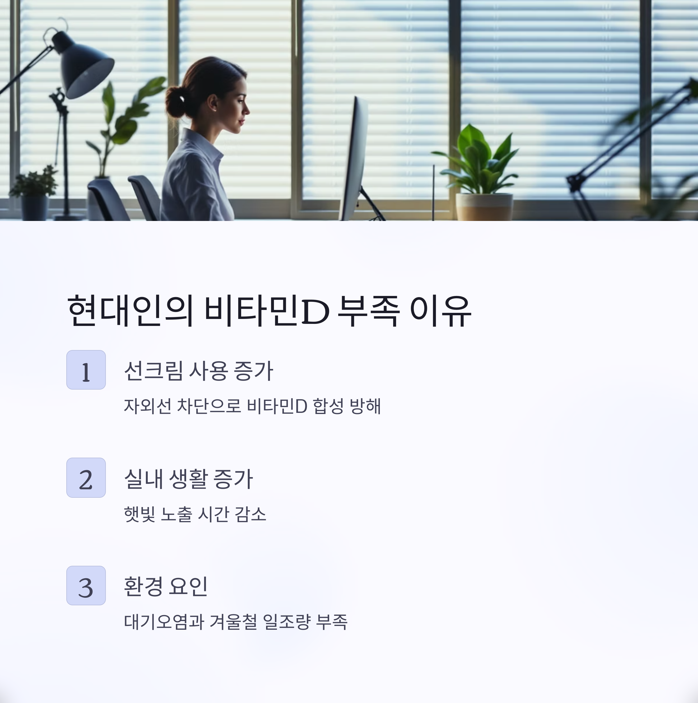 하지만 현대인들은 다음과 같은 이유로 비타민D 부족에 시달리고 있습니다: