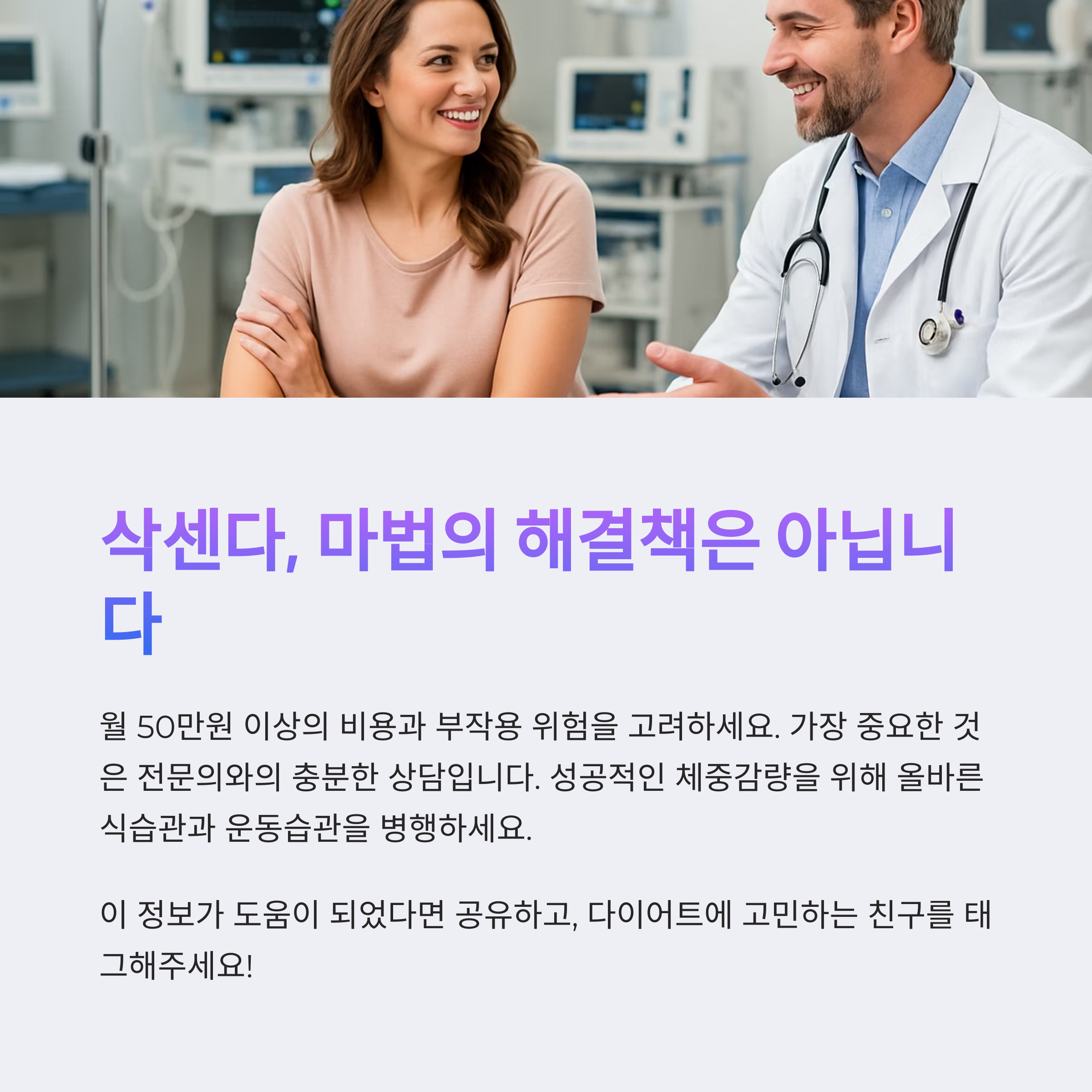 가장 중요한 것은 전문의와의 충분한 상담입니다. 개인의 건강 상태, 비만 정도, 생활습관을 종합적으로 평가받은 후 시작하시기 바랍니다.
