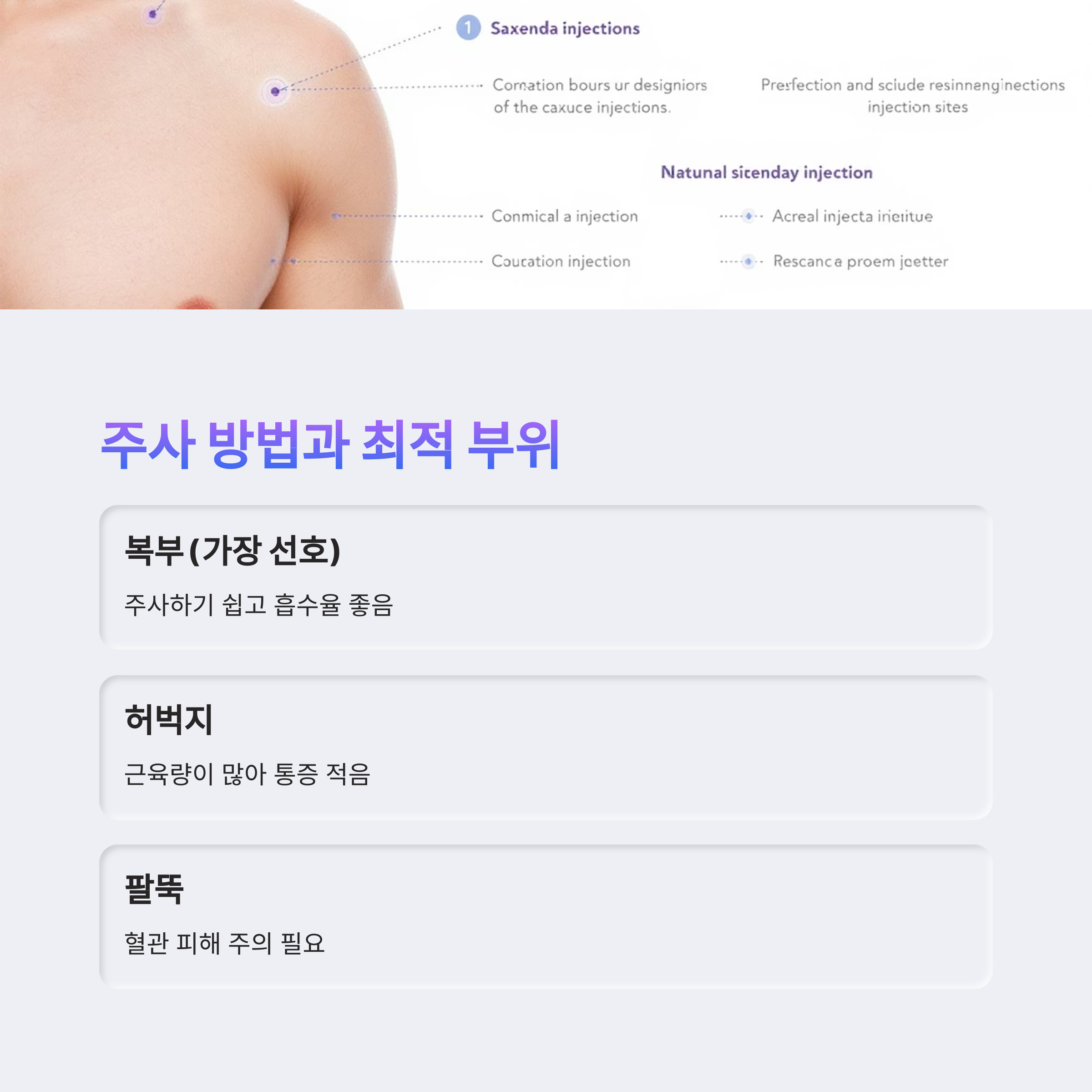 - 복부 (가장 선호): 주사하기 쉽고 흡수율 좋음