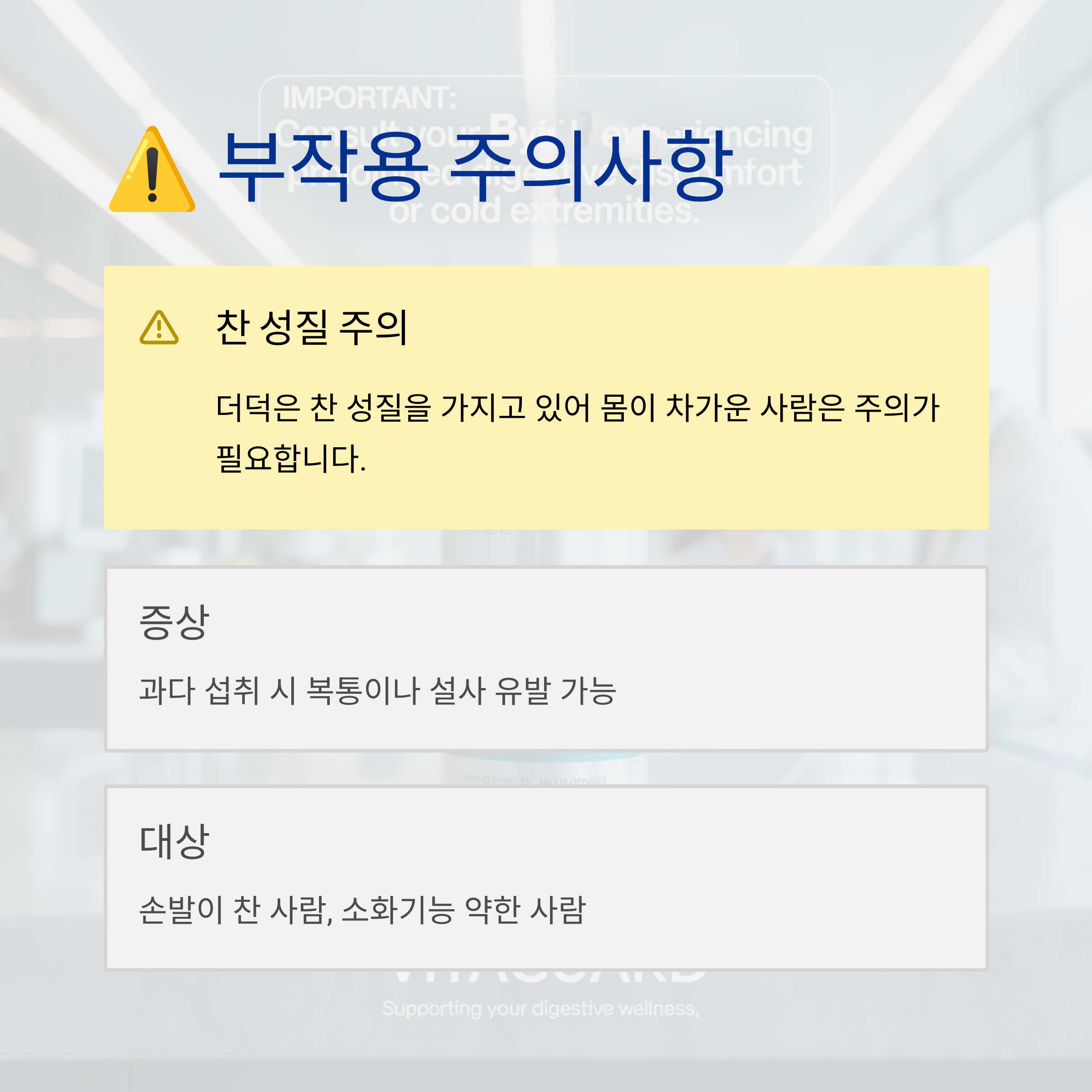 더덕 자체가 찬 성질을 지니고 있어 평소 몸이 차갑거나 손발이 찬 사람들이 많이 섭취하게 되면 복통이나 설사를 유발할 수 있습니다.