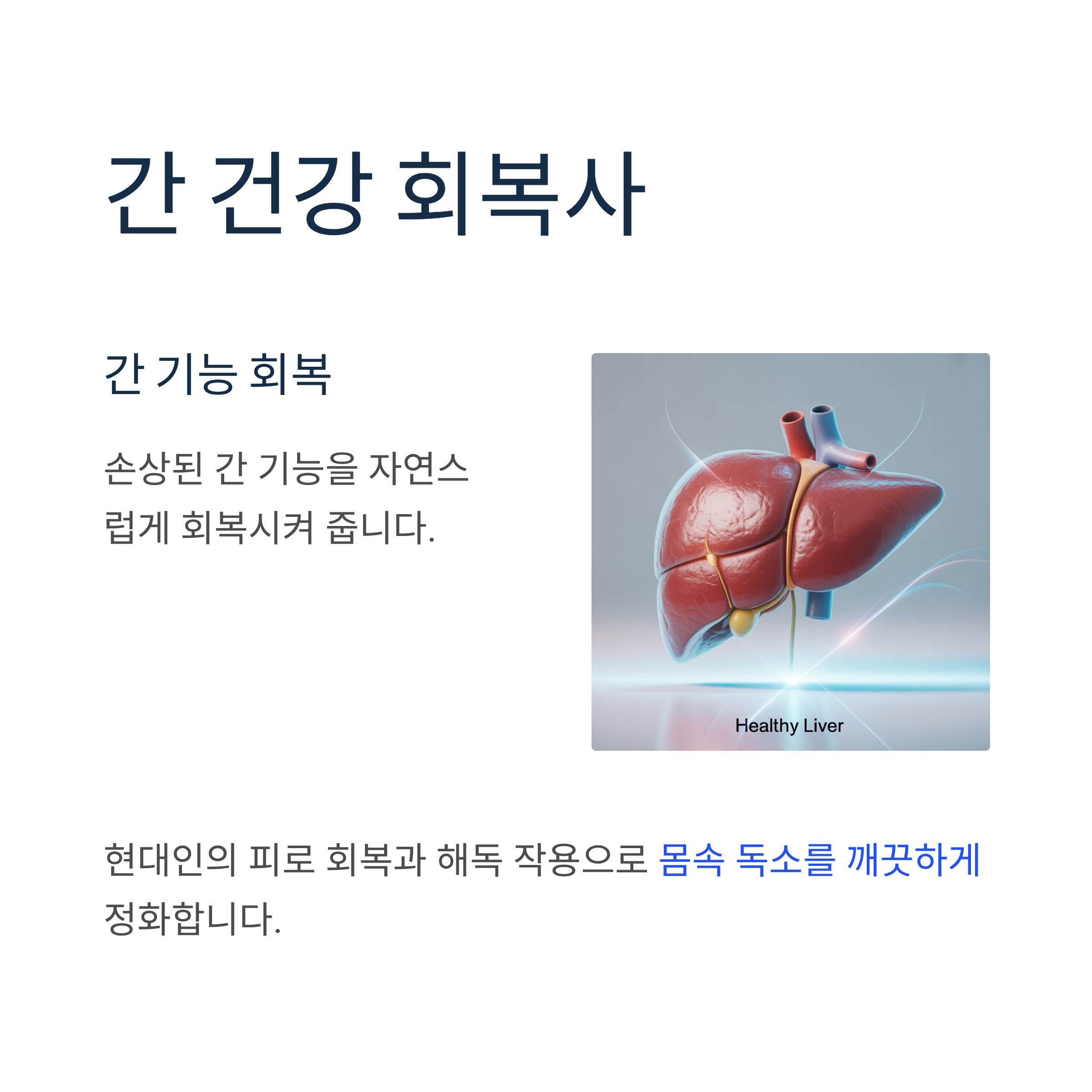 간 기능회복과 간 해독에도 효과가 있어, 현대인의 피로 회복과 해독에 도움을 줍니다.