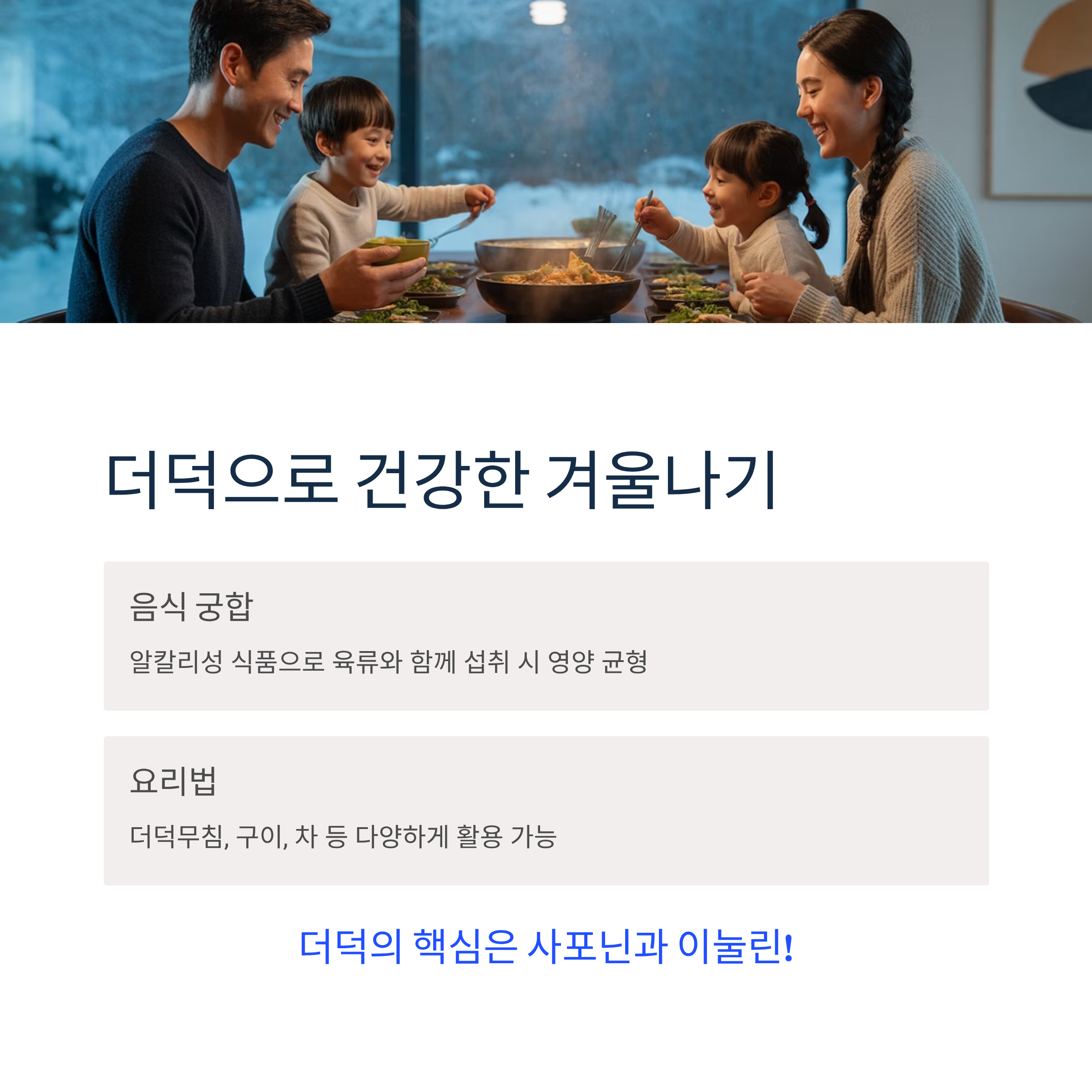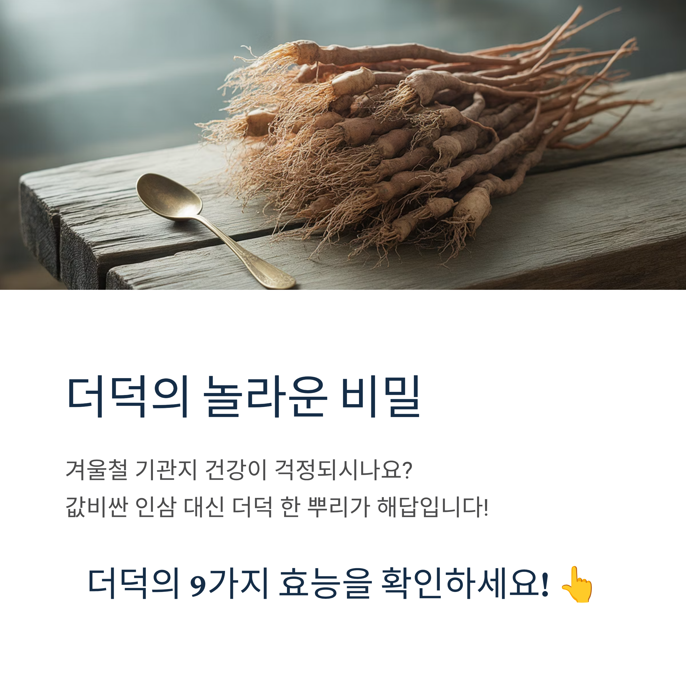 더덕은 겨울철 건강관리에 필수적인 식재료입니다. 특히 호흡기가 약한 분들이나 면역력 강화가 필요한 분들에게 추천합니다. 다만 체질에 따른 부작용을 고려하여 적정량을 섭취하는 것이 중요합니다.