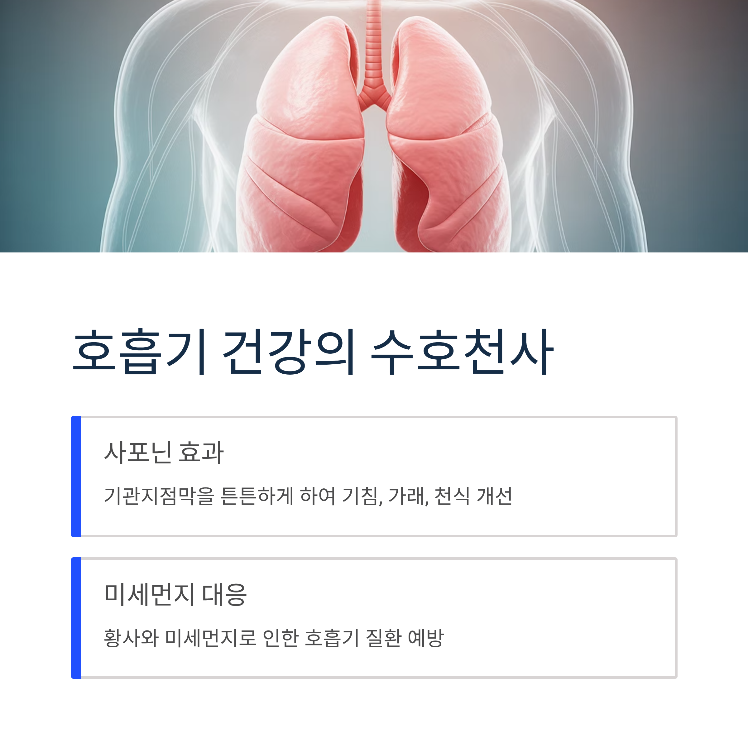 더덕의 가장 대표적인 효능은 호흡기 질환 개선입니다. 사포닌은 기관지점막을 튼튼하게 해 기침이나 가래, 천식증상을 개선하며 미세먼지나 황사로 인한 호흡기질환을 예방합니다.
