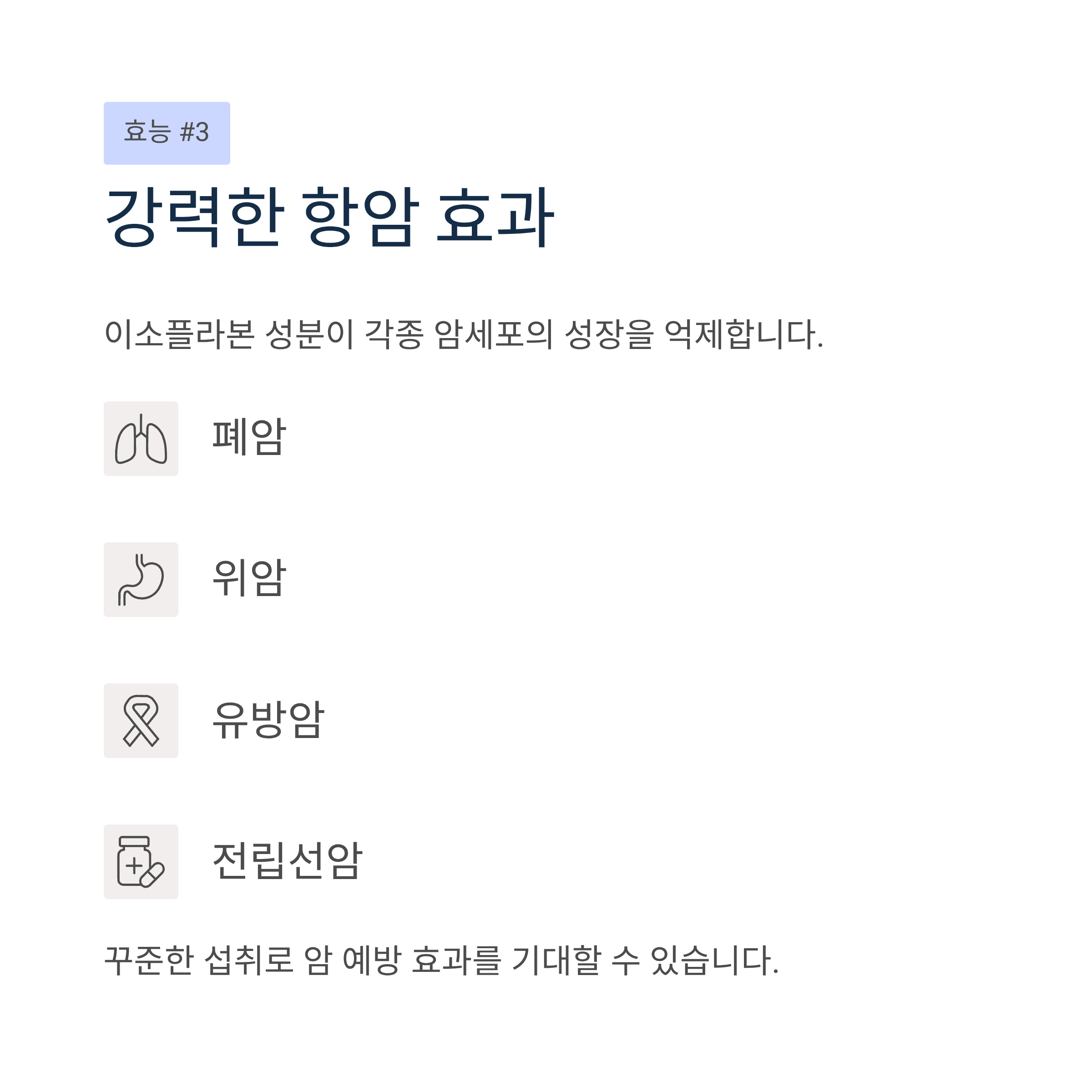 이소플라본 성분은 강력한 항암 작용을 하며, 폐암, 위암, 유방암, 전립선암 등 각종 암세포의 성장을 억제합니다. 꾸준한 섭취 시 암 예방에 도움이 됩니다.
