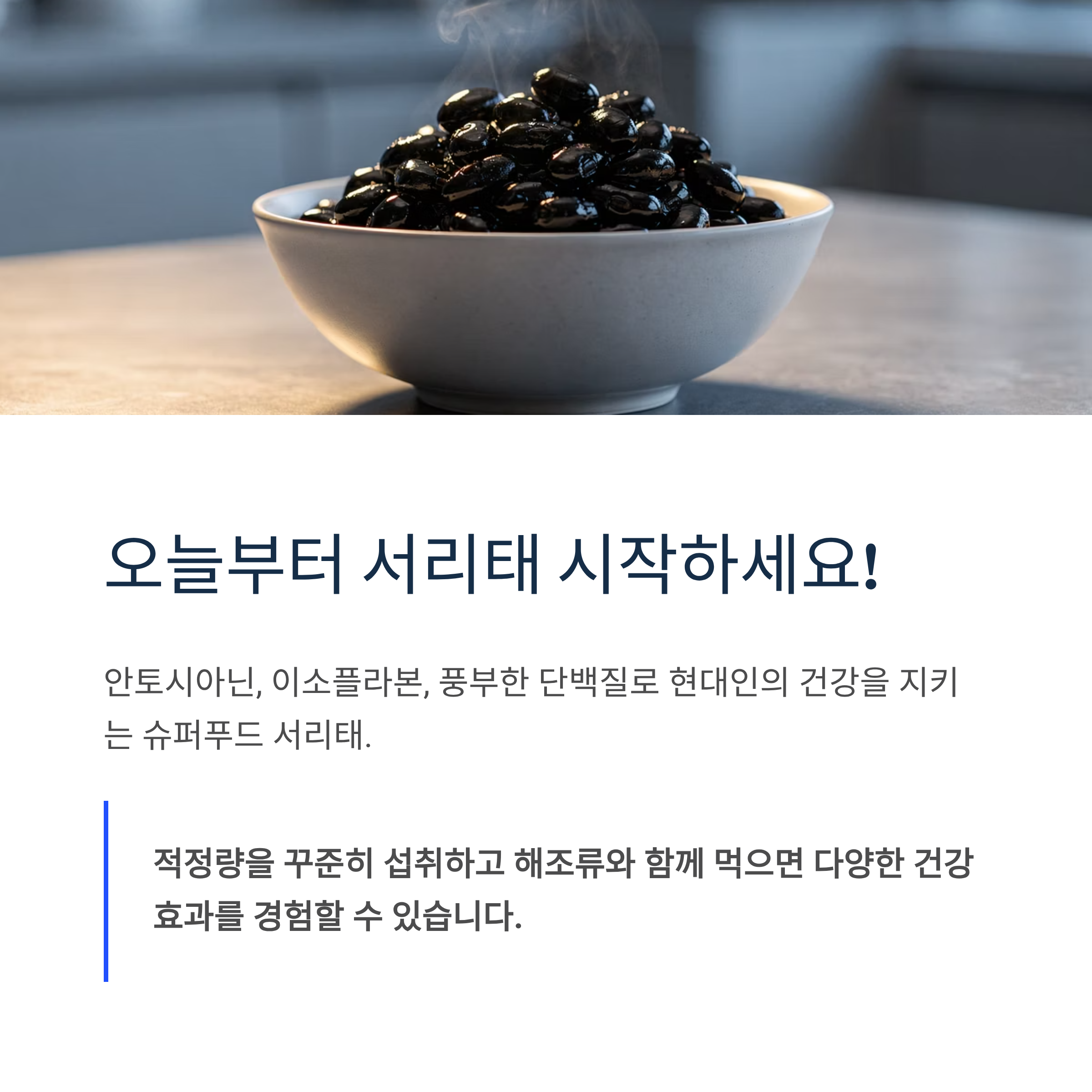 서리태는 안토시아닌, 이소플라본, 풍부한 단백질로 현대인의 건강을 지키는 슈퍼푸드입니다. 적정량을 꾸준히 섭취하고 해조류와 함께 먹으면 노화 방지, 심혈관 건강, 다이어트까지 다양한 건강 효과를 경험할 수 있습니다.