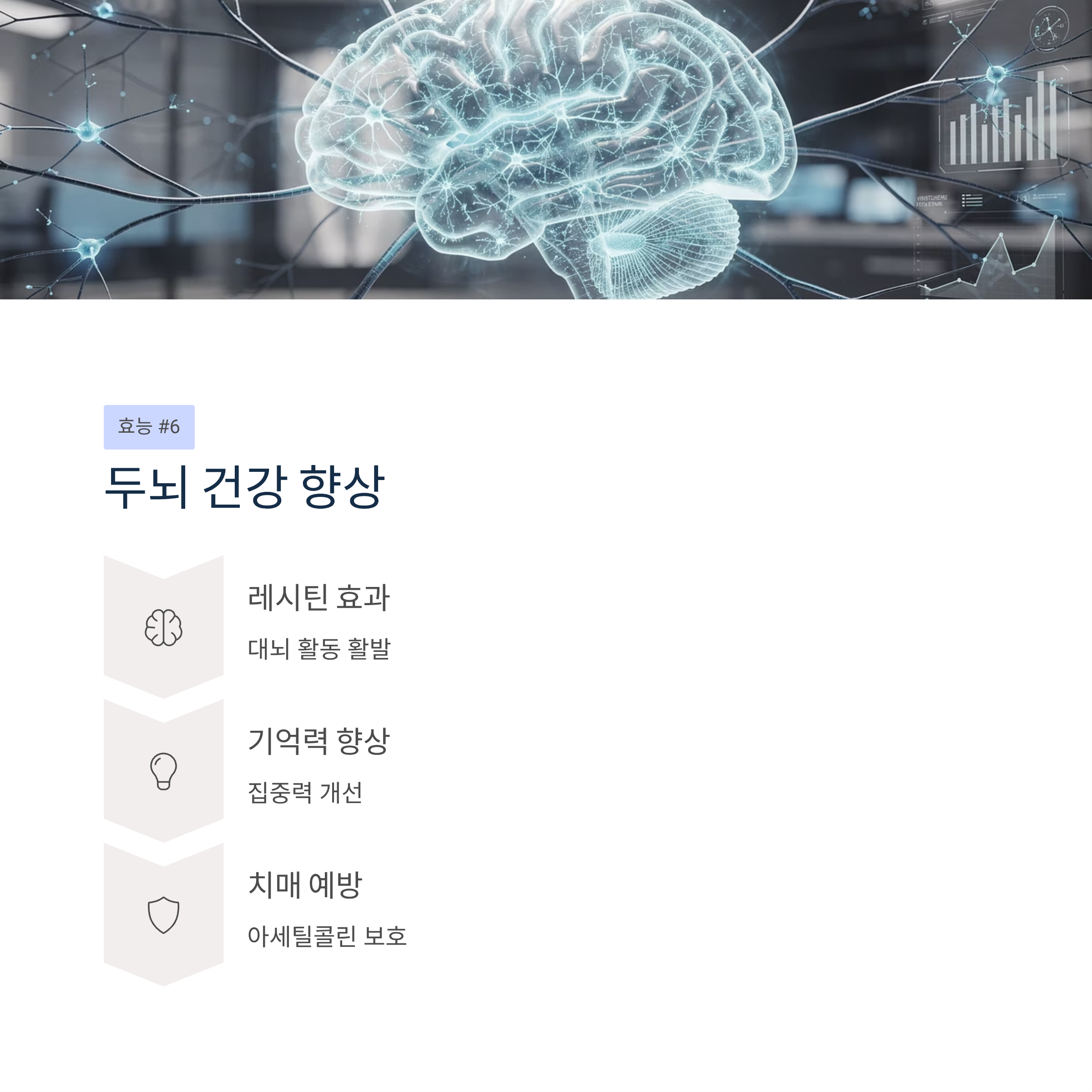 레시틴 성분이 대뇌 활동을 활발하게 하고 아세틸콜린 감소를 억제하여 기억력과 집중력 향상에 도움을 줍니다. 치매 예방에도 뛰어난 효능이 있습니다.
