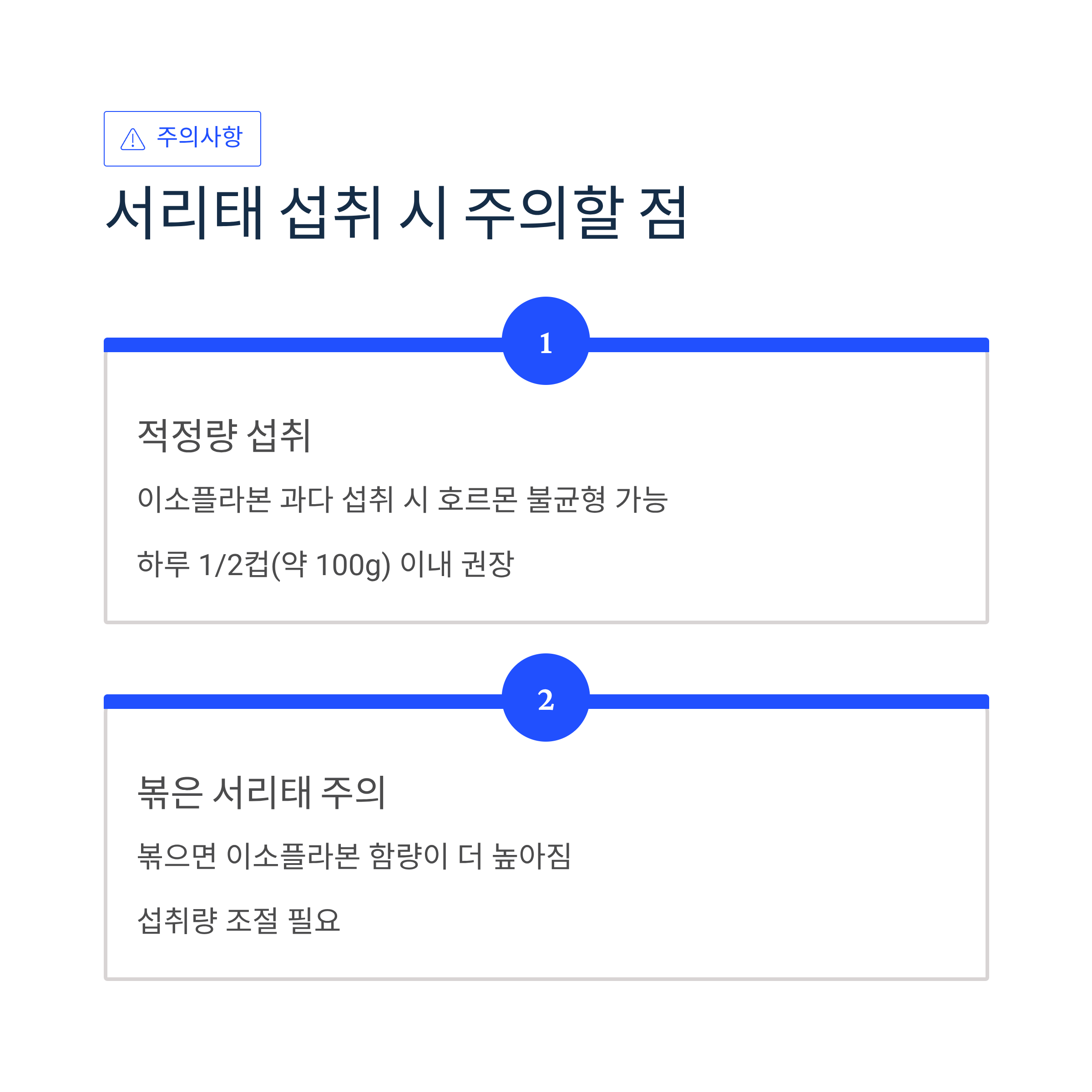 서리태에 함유된 이소플라본은 과다 섭취 시 호르몬 불균형을 일으킬 수 있으므로 적정량을 지켜야 합니다. 특히 볶아 먹을 경우 이소플라본 함량이 더 높아지므로 하루 1/2컵(약 100g) 이내로 섭취하는 것이 좋습니다.