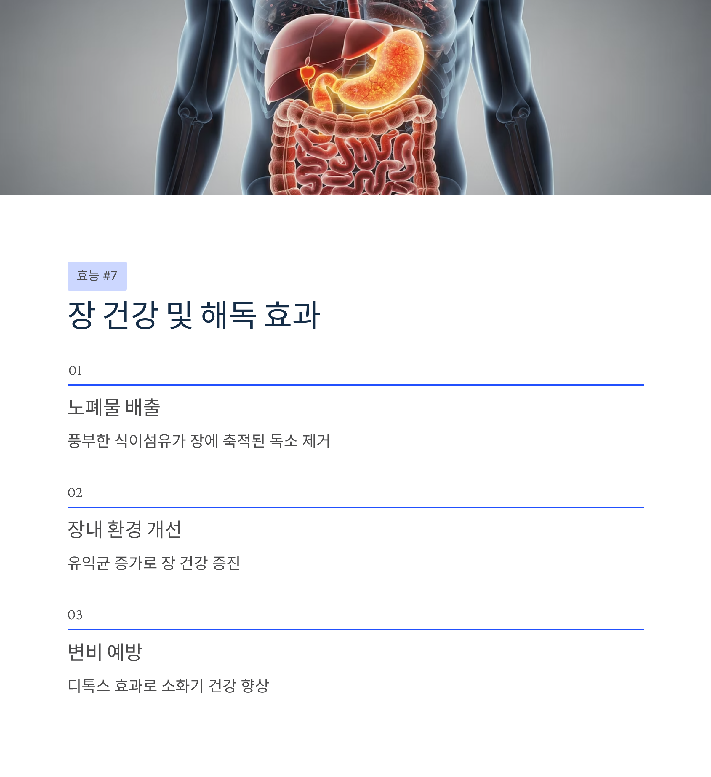 풍부한 식이섬유가 장에 축적된 노폐물을 배출하고 장내 환경을 개선합니다. 변비 예방과 디톡스 효과를 통해 전반적인 소화기 건강을 증진시킵니다.