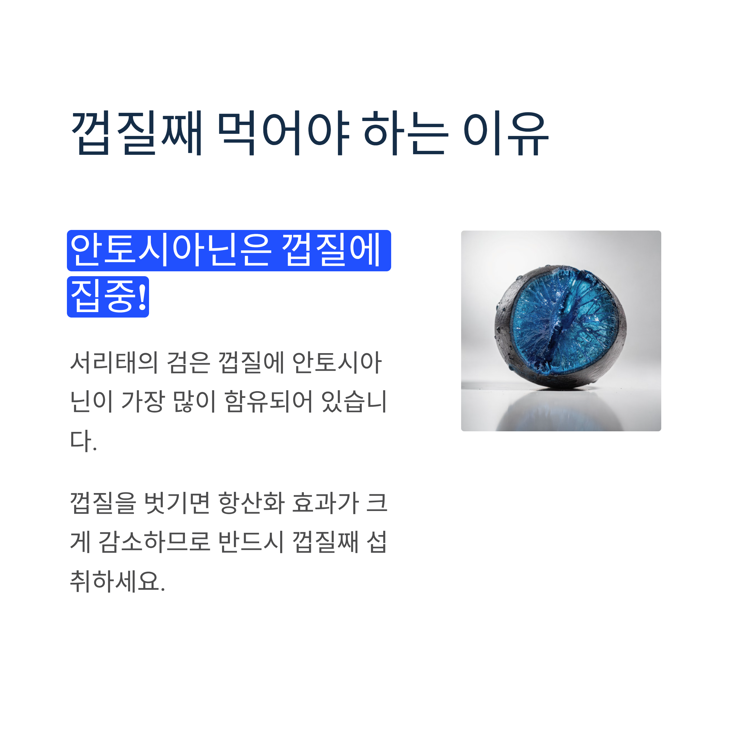 서리태 껍질에 풍부한 안토시아닌은 체내 활성산소를 제거하여 세포 노화를 늦추고 피부 탄력을 유지합니다. 비타민 E와 함께 작용하여 피부 주름 개선과 콜라겐 생성을 촉진합니다.