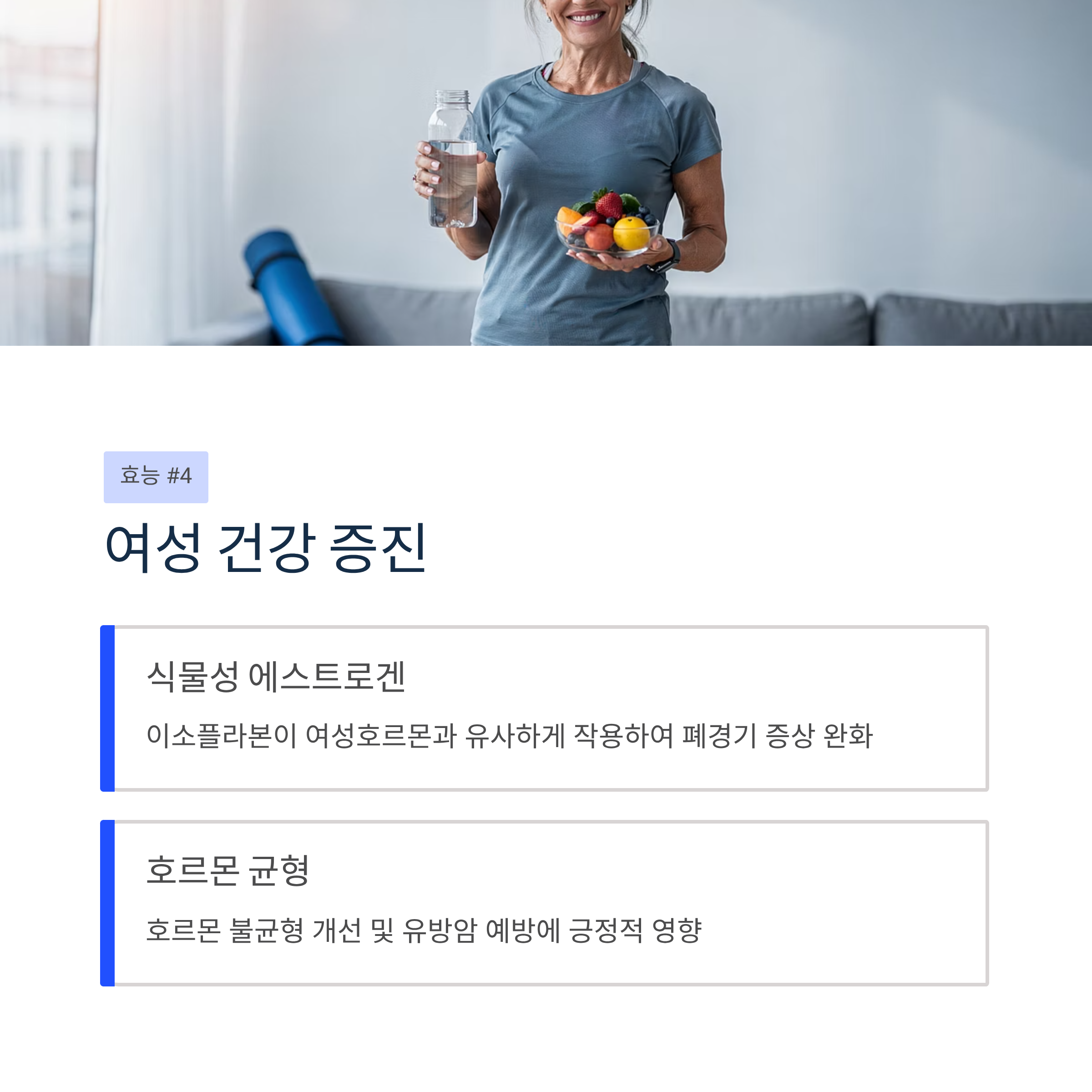 식물성 에스트로겐인 이소플라본이 여성호르몬과 유사한 작용을 하여 폐경기 증상을 완화하고 호르몬 불균형을 개선합니다. 유방암 예방에도 긍정적인 영향을 미칩니다.
