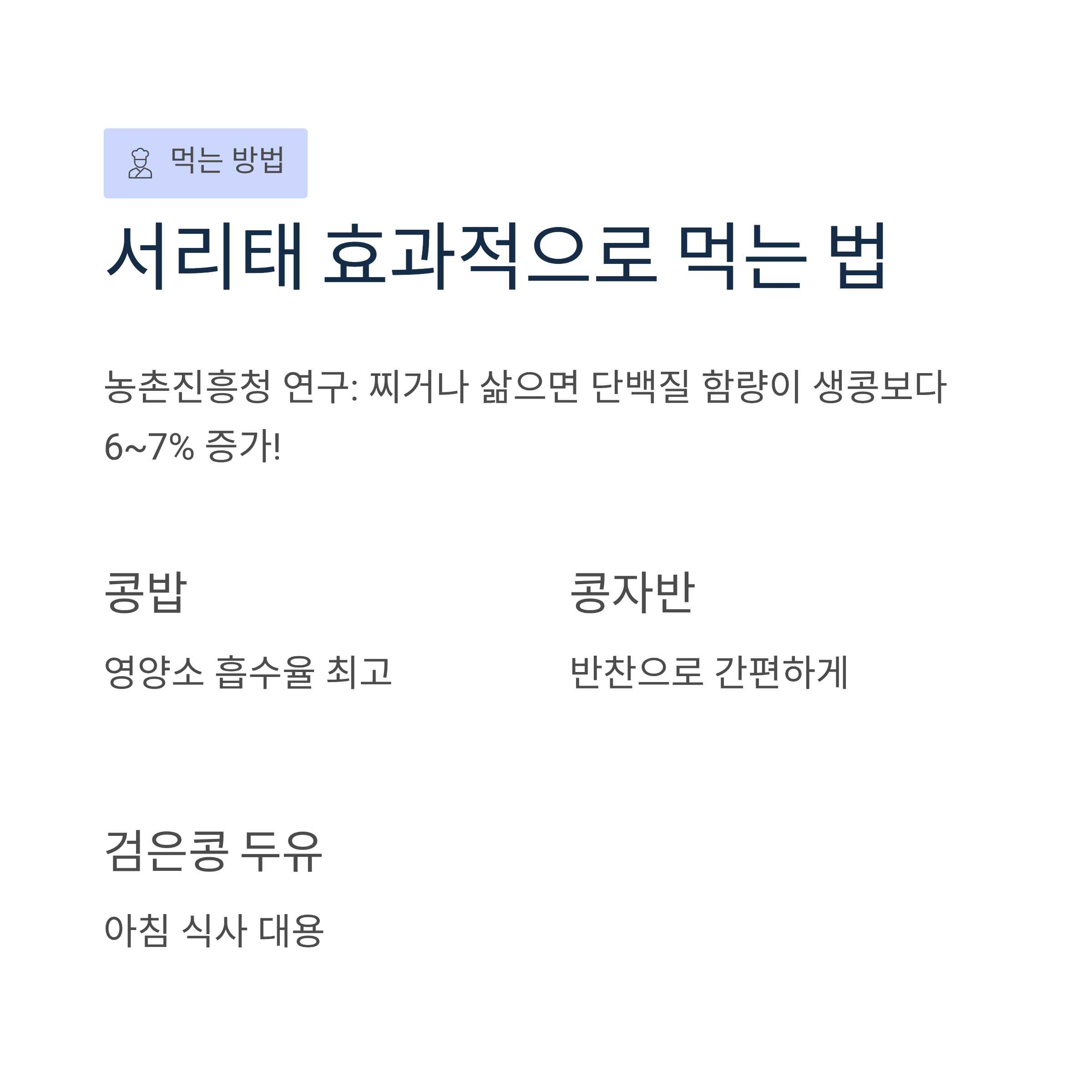 농촌진흥청 연구에 따르면 서리태를 찌거나 삶아 먹으면 단백질 함량이 생콩보다 6~7% 증가하여 영양소 흡수율이 높아집니다. 콩밥, 콩자반, 검은콩 두유, 청국장 등 다양한 방법으로 섭취할 수 있으며, 껍질째 먹어야 안토시아닌의 효능을 최대로 얻을 수 있습니다.