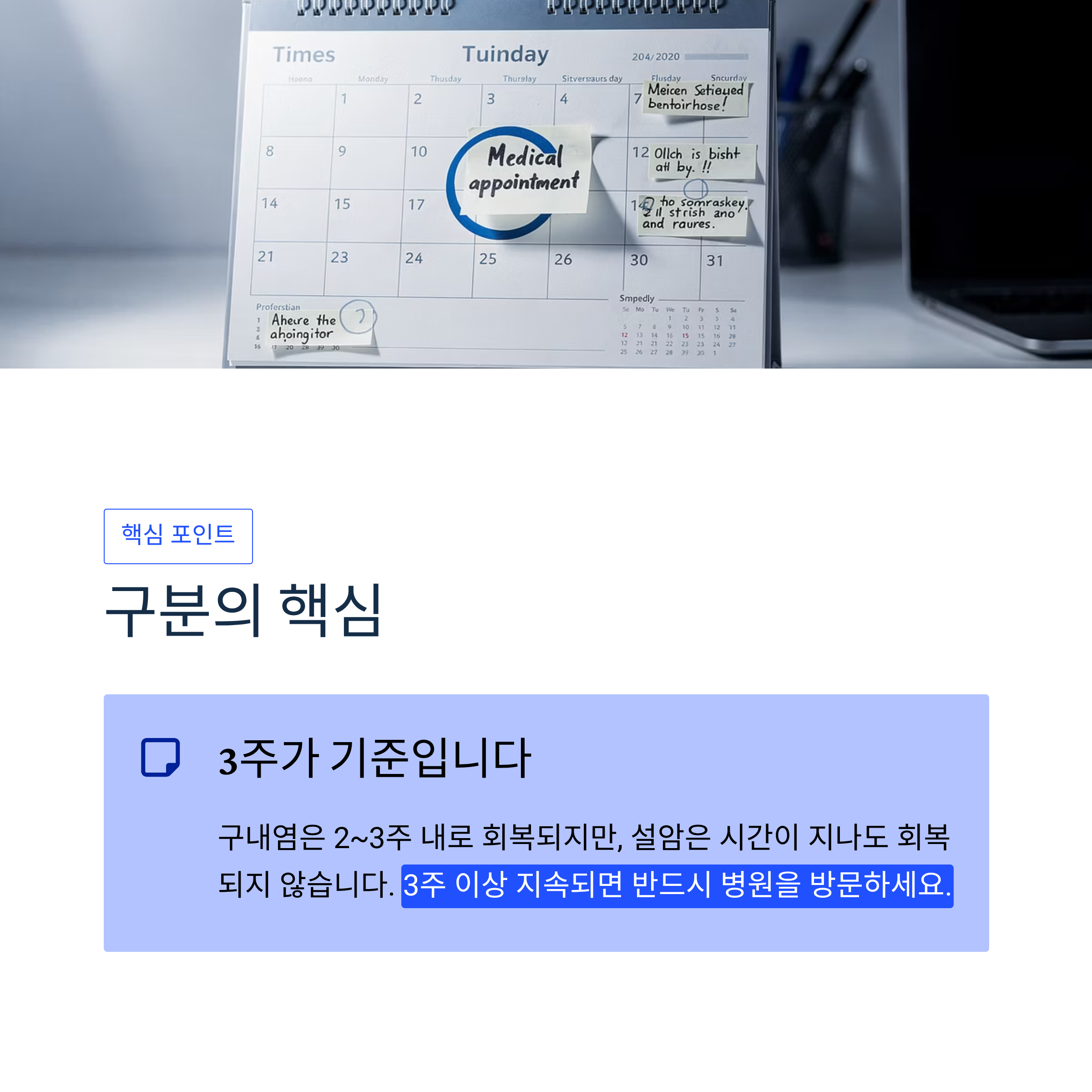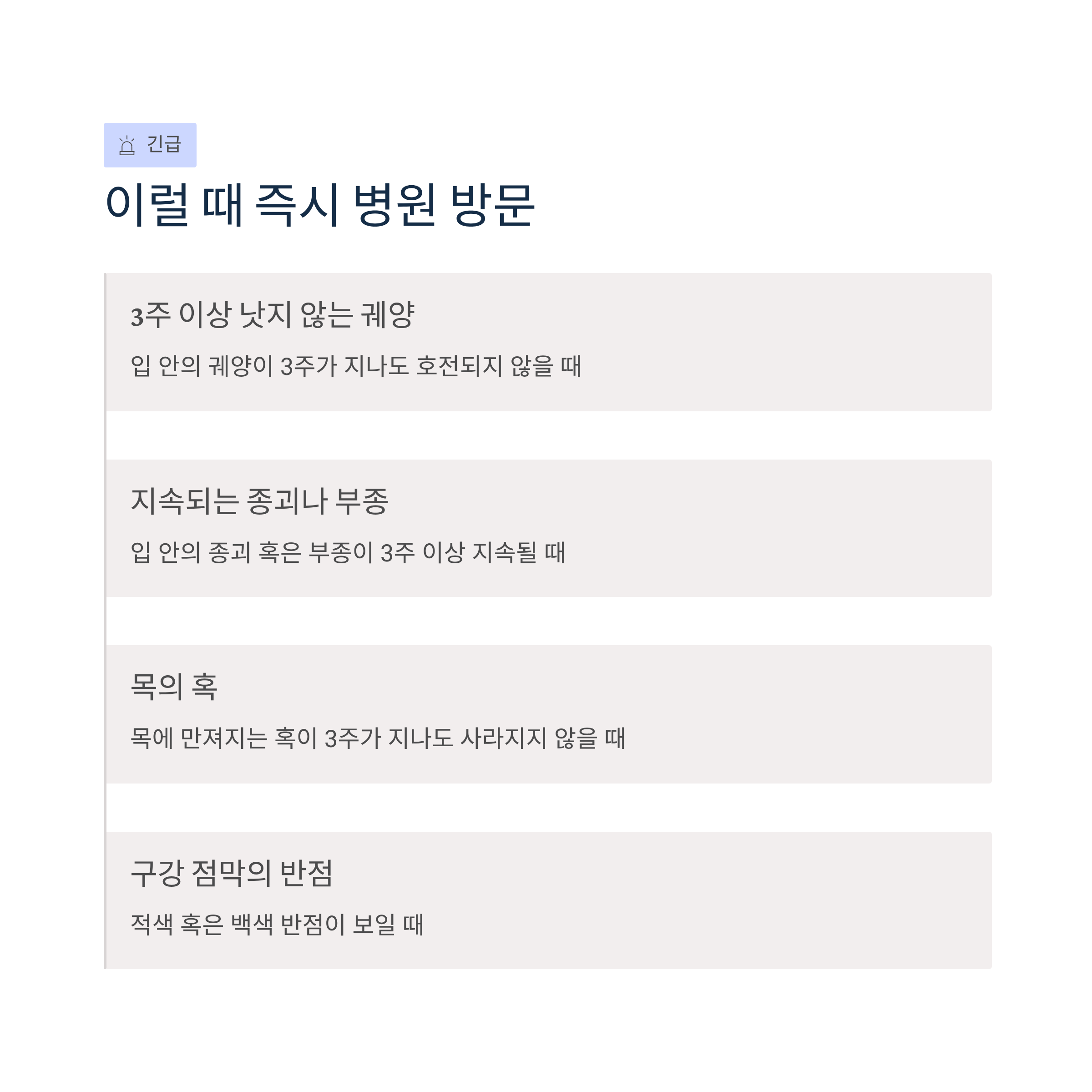 - 입 안의 종괴 혹은 부종이 3주 이상 지속될 때