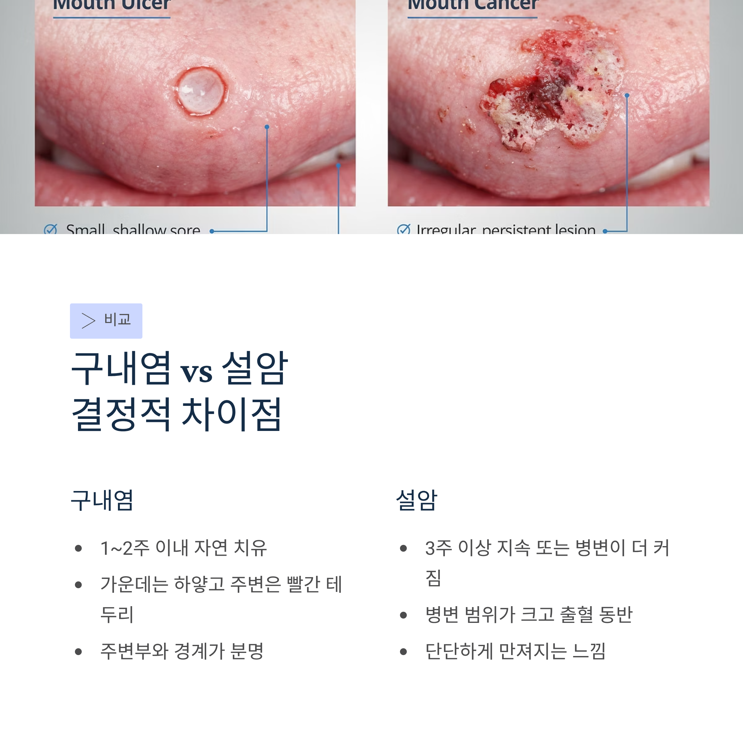 설암은 구내염과 비교해 병변의 범위가 크고 출혈이나 통증이 지속될 수 있으며, 목 주변 림프절로 전이되기 쉬워 턱밑이나 목 옆부분에 단단하게 만져지는 종괴가 있을 수 있습니다.