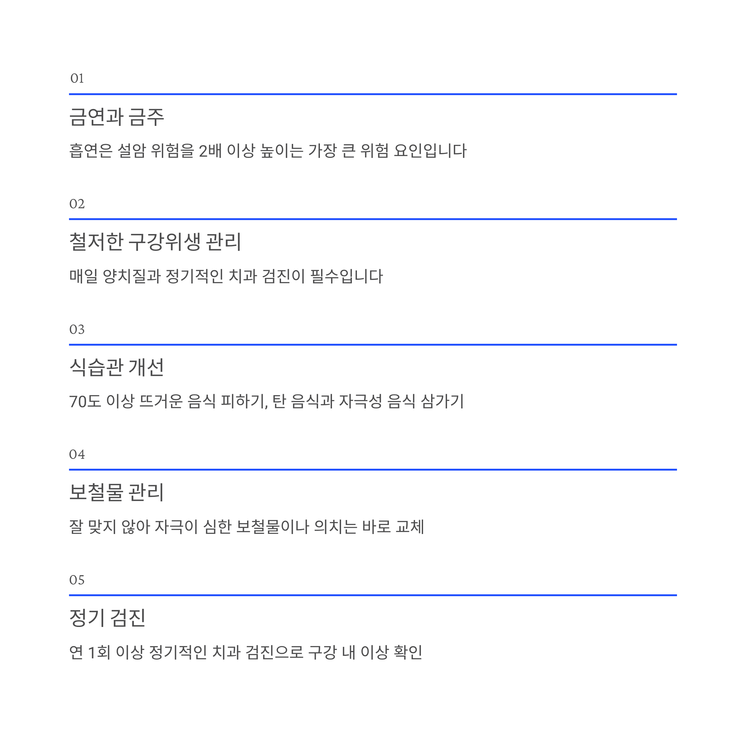 매일 양치질과 정기적인 치과 검진이 필수입니다.