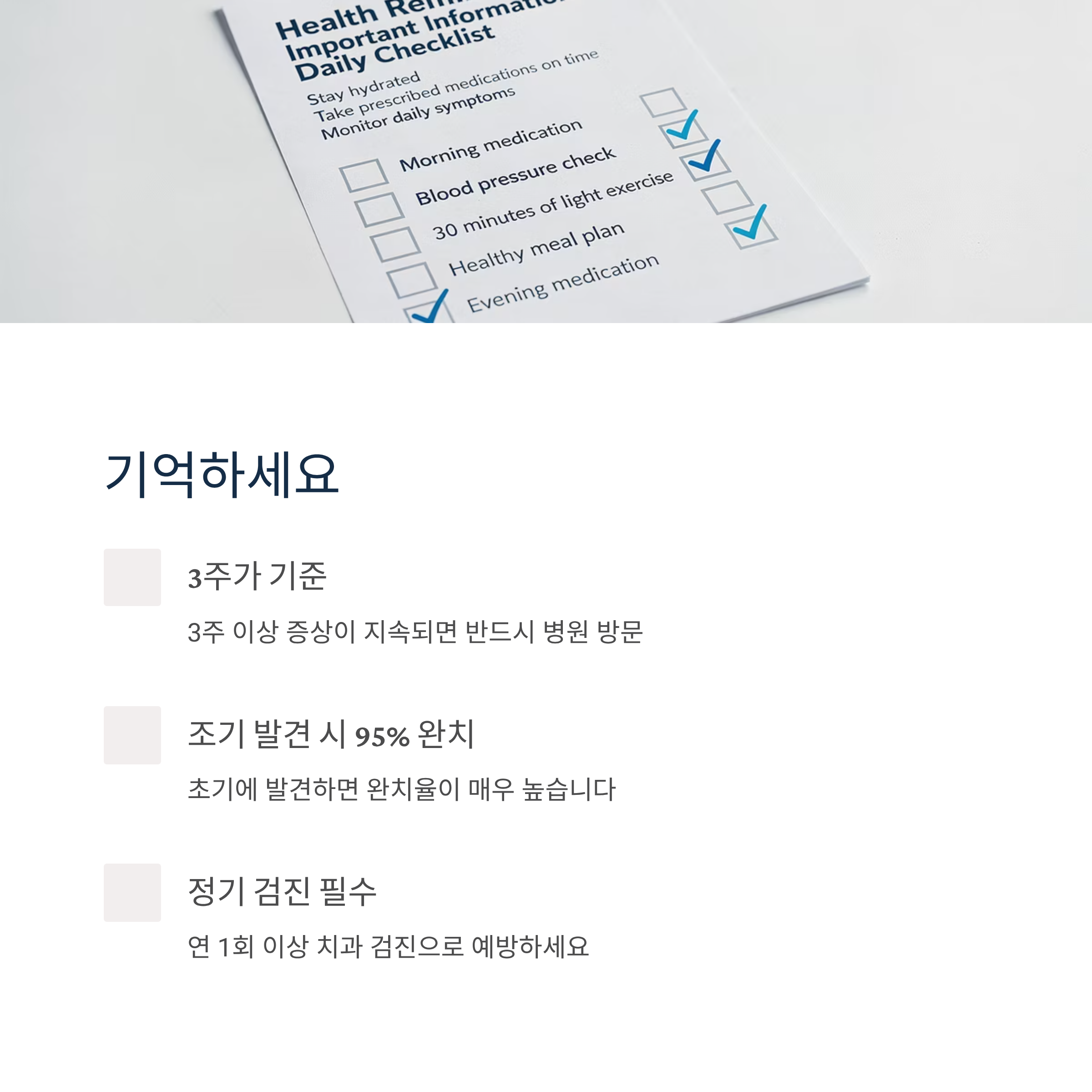 설암은 발생 부위가 눈에 잘 띄어 조기 발견이 가능한 암입니다. 무엇보다 중요한 것은 혀와 구강 내 변화에 관심을 가지고, 의심 증상이 3주 이상 지속되면 즉시 전문의 진료를 받는 것입니다.