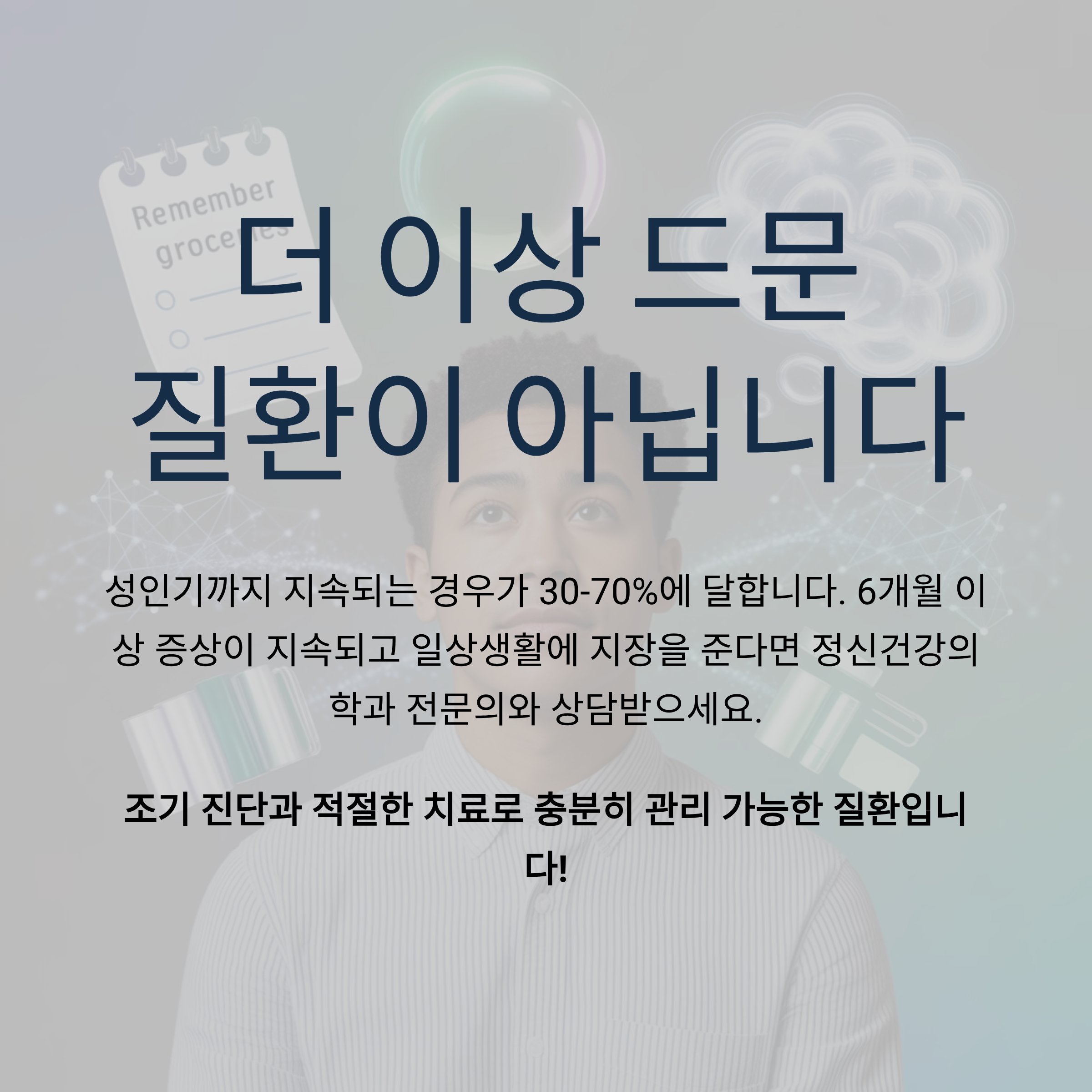 성인 ADHD는 더 이상 드문 질환이 아닙니다. 청소년기 이후 성인기까지 지속되는 경우도 30%에서 많게는 70%에 이르는 것으로 밝혀졌습니다. 만약 위의 증상들이 6개월 이상 지속되고 일상생활에 지장을 준다면, 정신건강의학과 전문의와 상담을 받아보시기 바랍니다. 조기 진단과 적절한 치료를 통해 충분히 관리 가능한 질환임을 기억하세요.