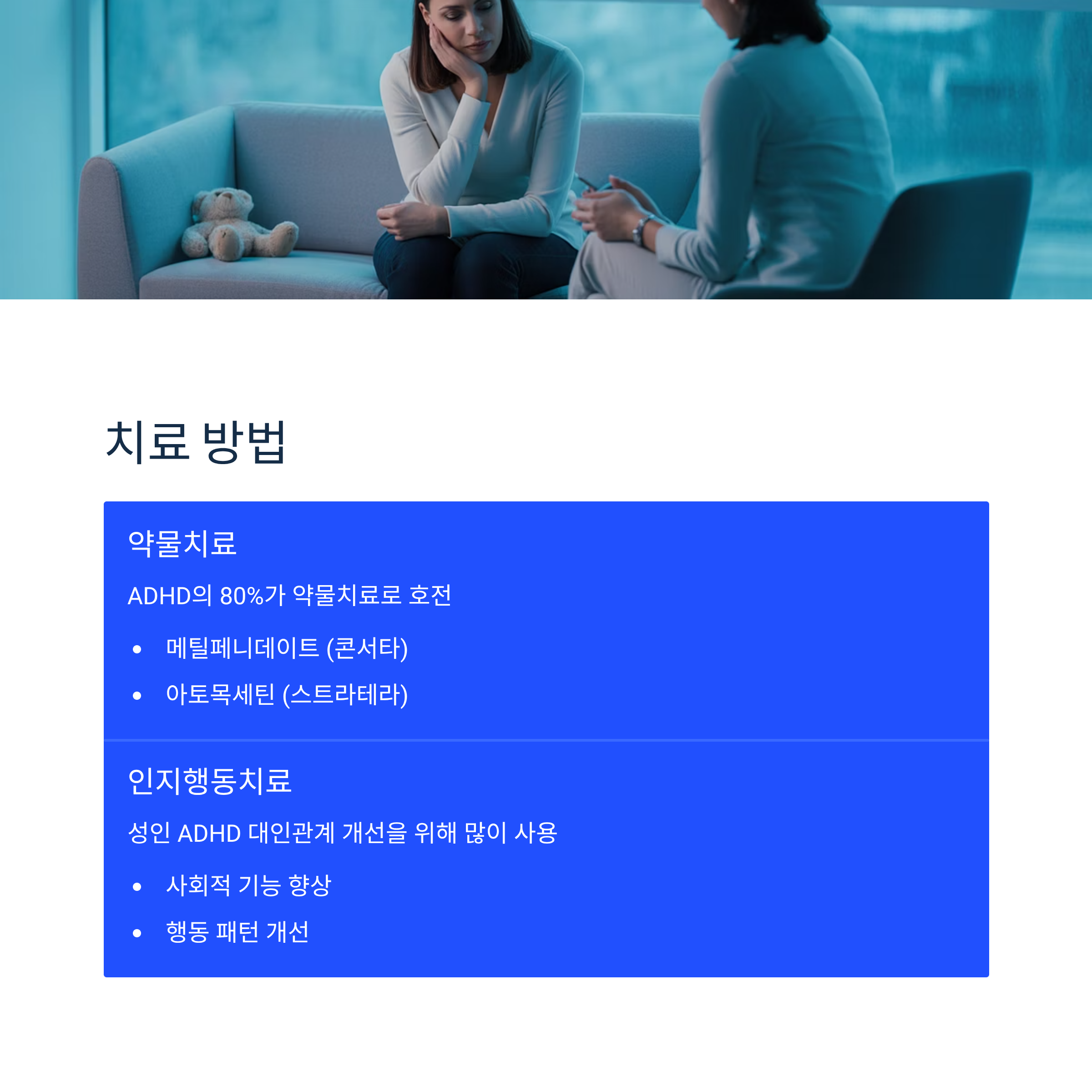 성인 ADHD의 경우 대인 관계를 원만하게 하기 위해 인지행동 치료를 많이 사용합니다.