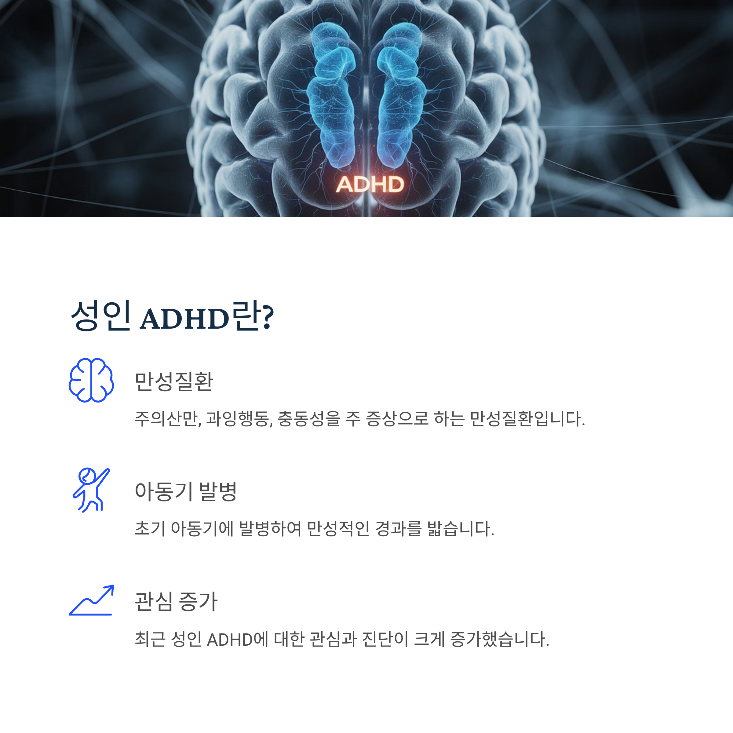 성인 ADHD는 주의산만, 과잉행동, 충동성을 주 증상으로 보이는 만성질환이며 대개 초기 아동기에 발병하여 만성적인 경과를 밟는 특징을 지닙니다. 과거에는 성인 ADHD가 흔하지 않은 것으로 간주되었지만, 최근 성인 ADHD에 대한 관심이 증가하였습니다.