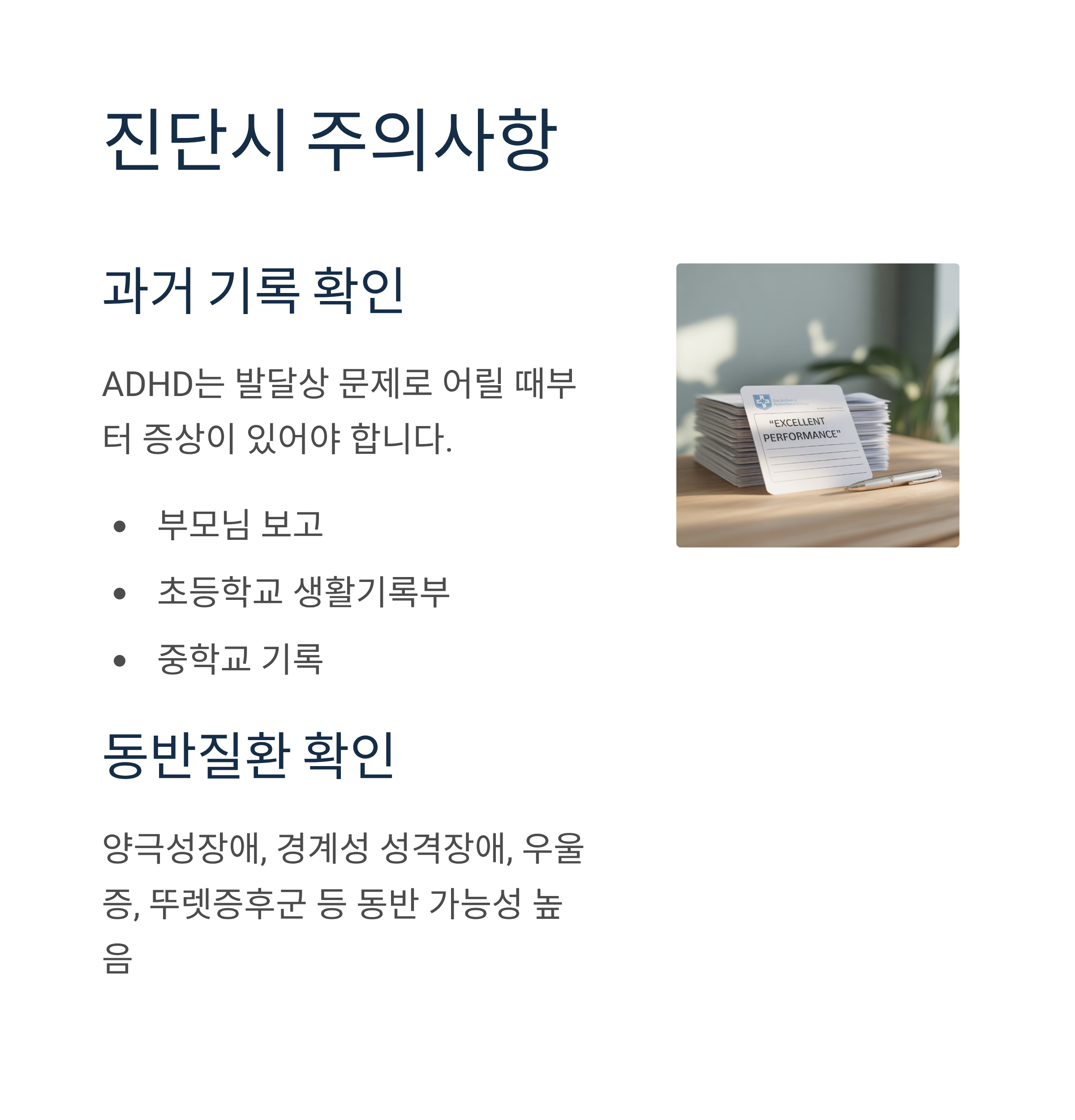 ADHD는 보통 발달상의 문제라서 어릴 때부터 문제점이 조금씩 있어야 하고, 부모님의 보고, 초등, 중학교의 기록 등이 중요합니다. 초등학생 시기 생활기록부는 중요한 진단기준이 됩니다.