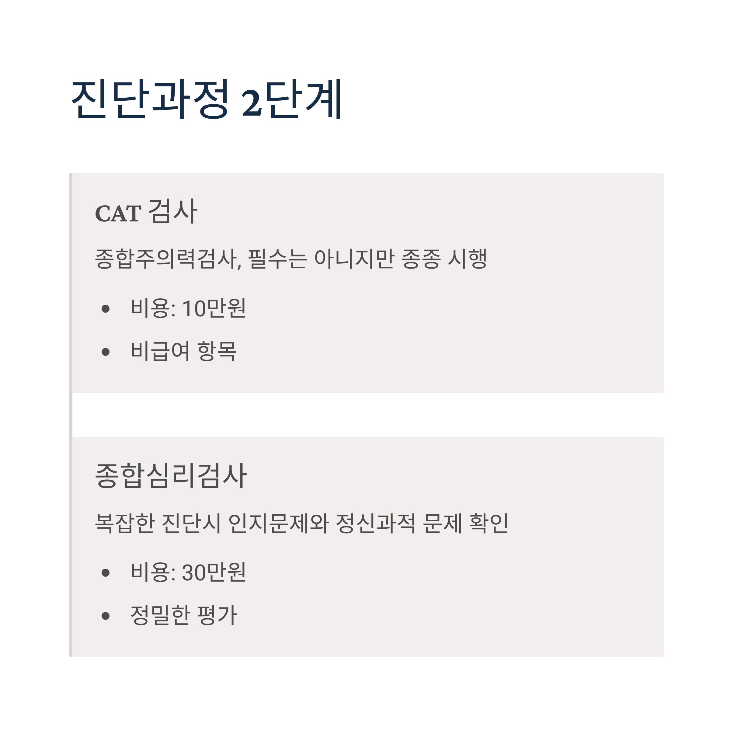 | 종합심리검사 | 300,000 | 비급여 | 감별진단 필요시 |