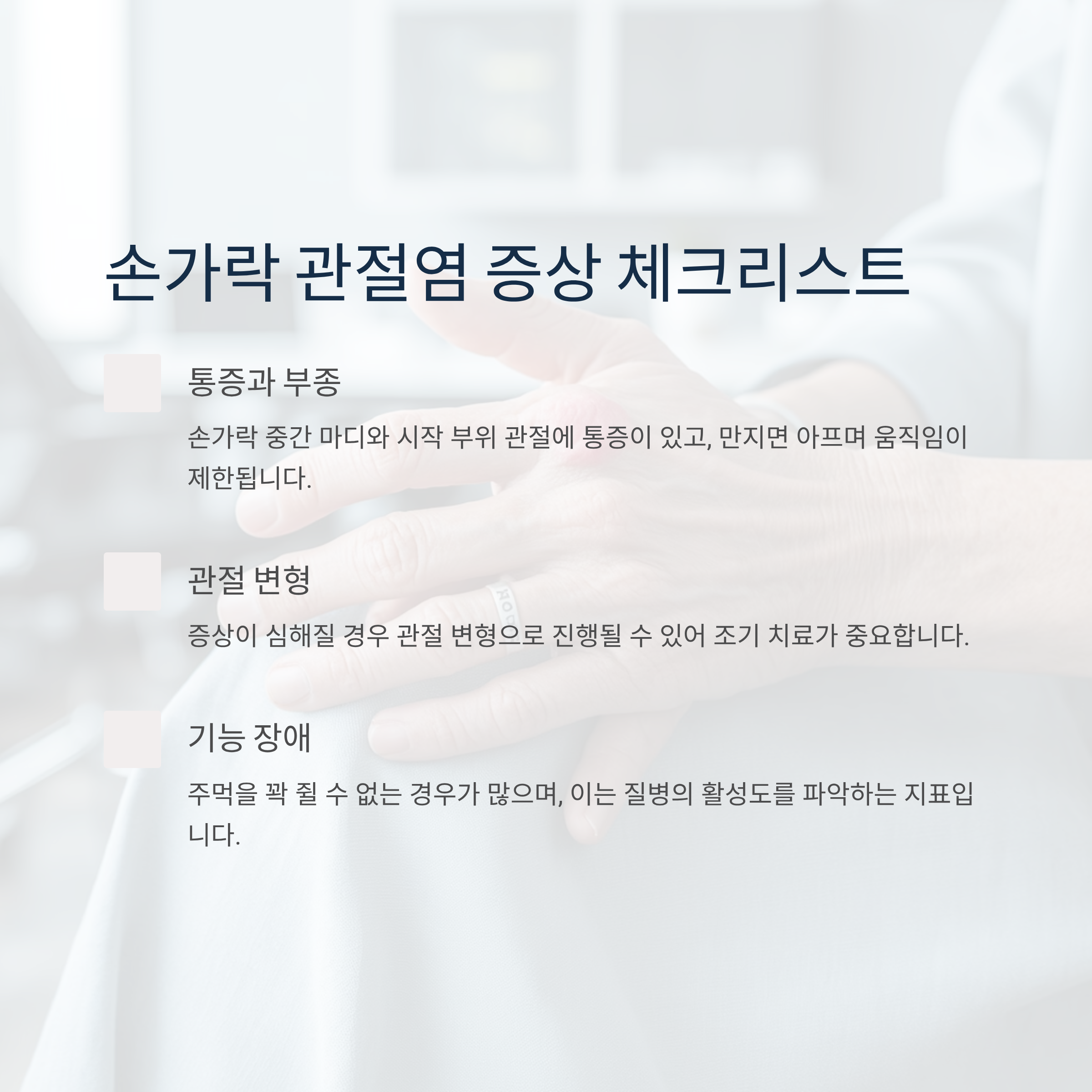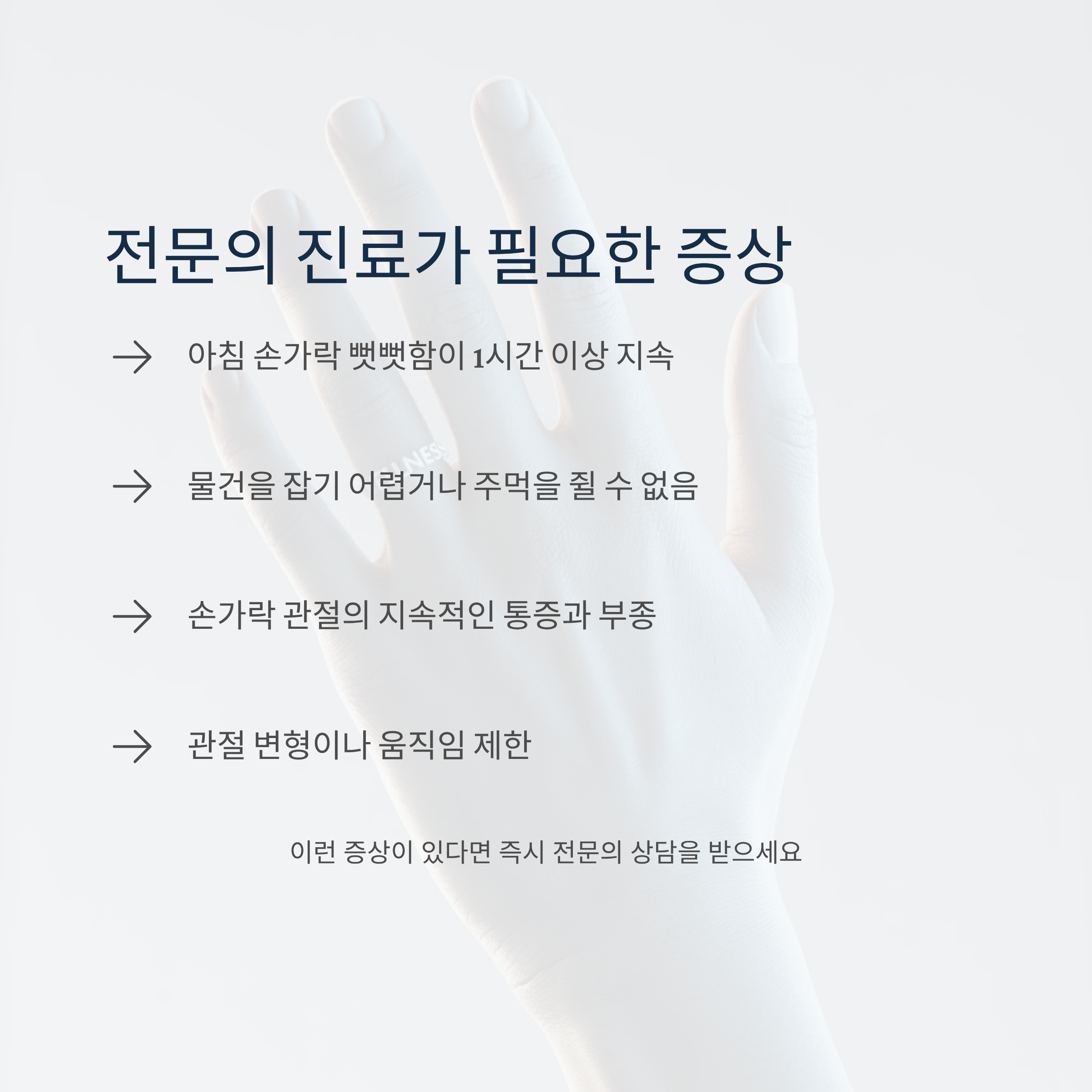 손가락 관절염의 가장 대표적인 증상은 아침에 일어났을 때 관절이 뻣뻣해져 움직이기 힘들다가 시간이 한참 지나서(1시간 이상) 풀리는 조조강직 현상입니다. 특히 류마티스 관절염의 경우 아침에 손가락들의 강직을 특징으로 하며, 이는 단순한 피로와는 다른 질병의 신호입니다.