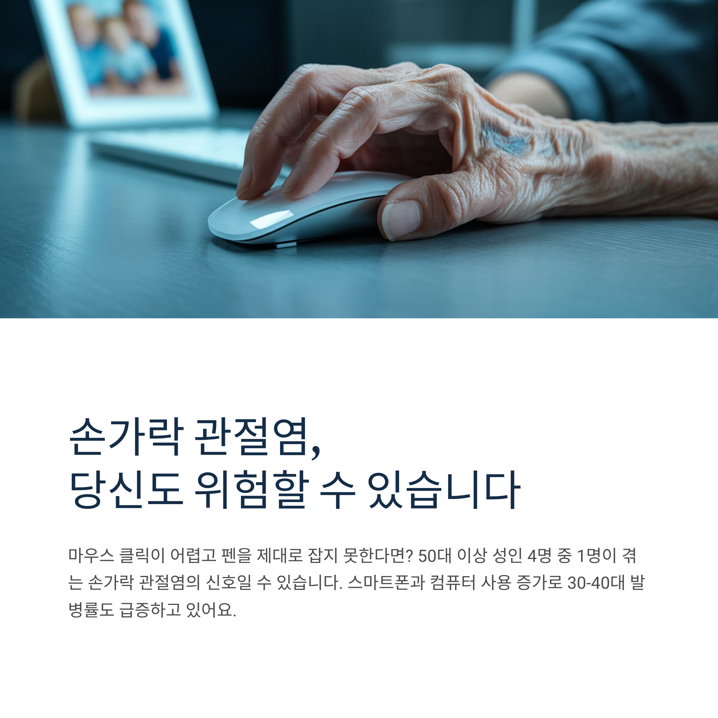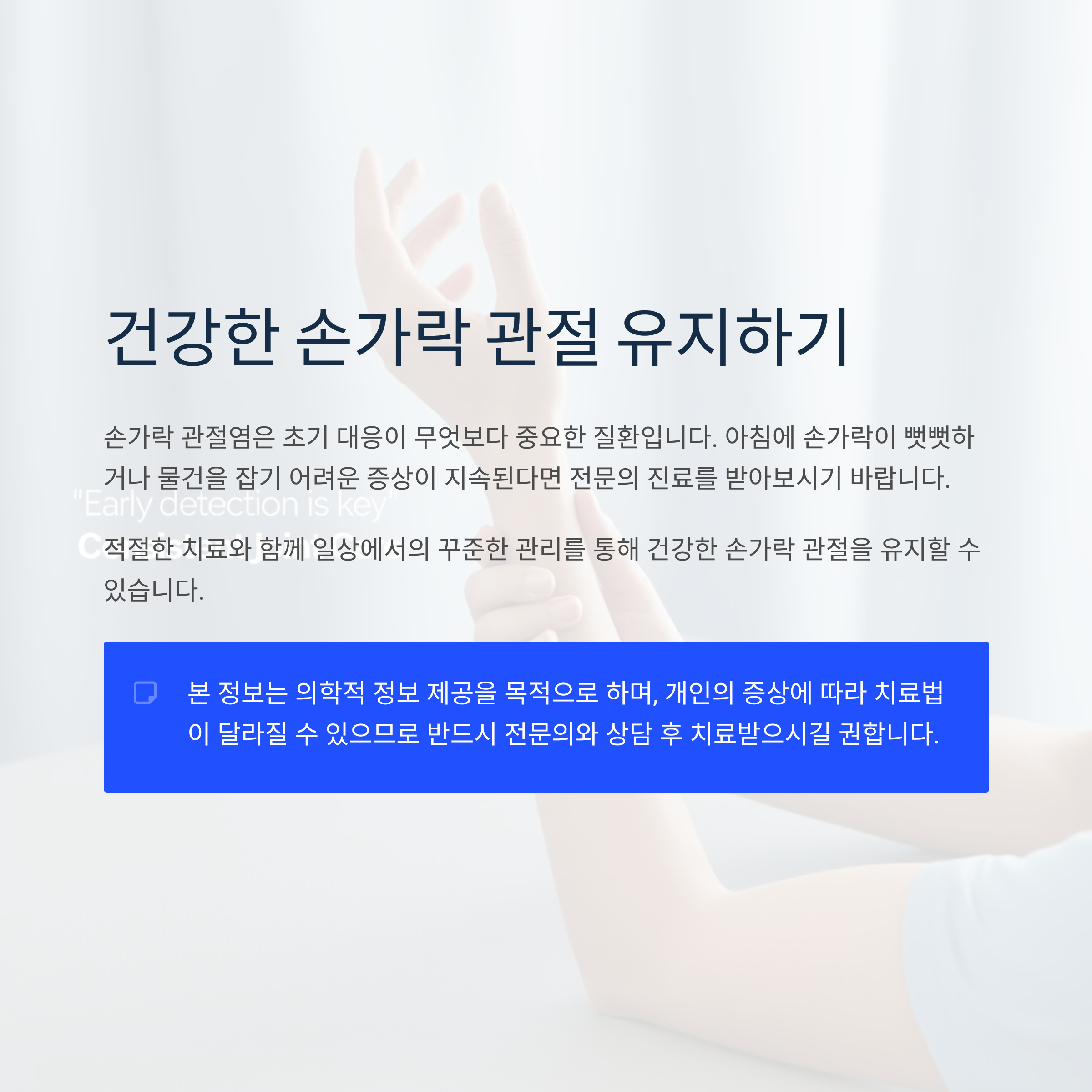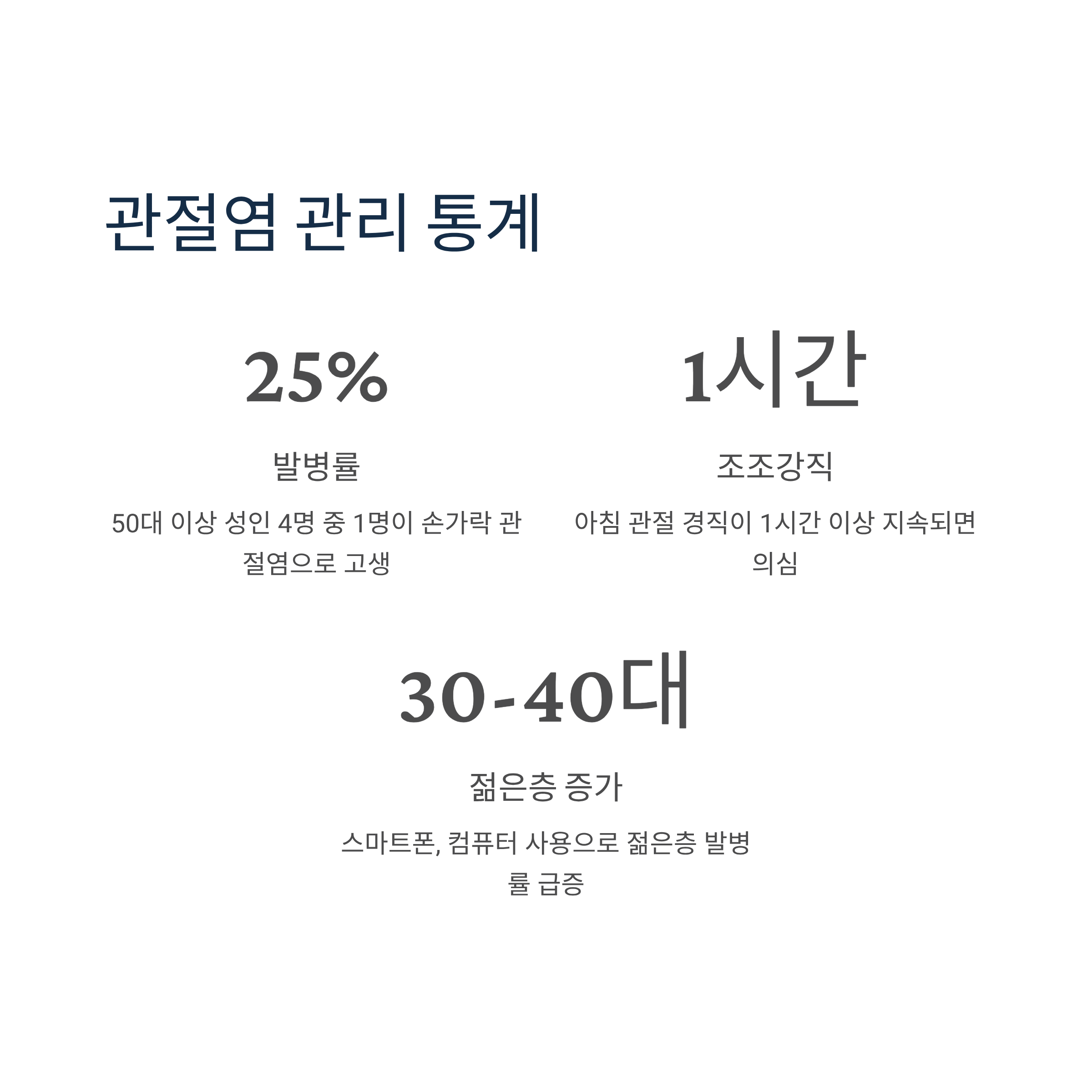 손가락 관절염은 초기 대응이 무엇보다 중요한 질환입니다. 아침에 손가락이 뻣뻣하거나 물건을 잡기 어려운 증상이 지속된다면 전문의 진료를 받아보시기 바랍니다. 적절한 치료와 함께 일상에서의 꾸준한 관리를 통해 건강한 손가락 관절을 유지할 수 있습니다.