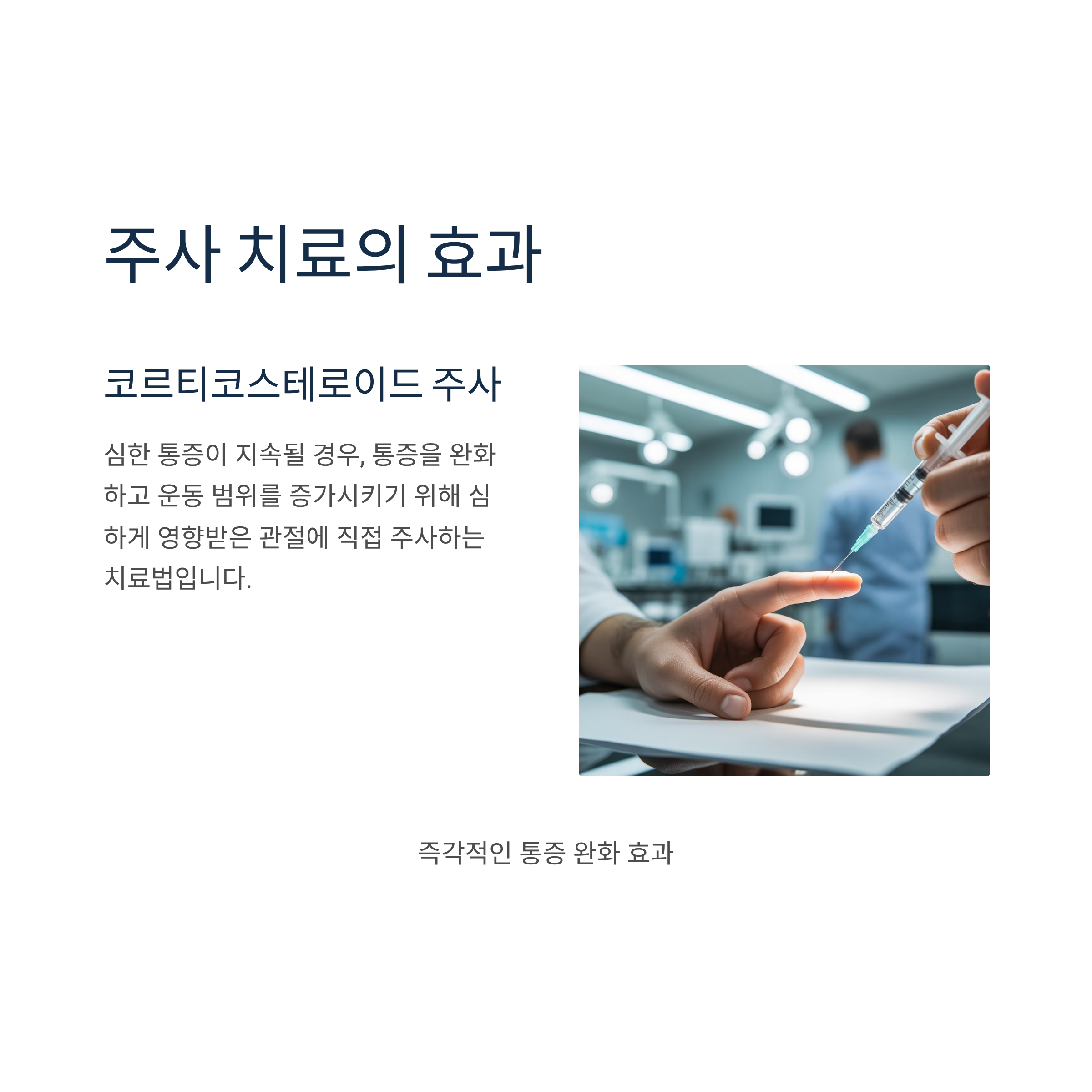 심한 통증이 지속될 경우, 통증을 완화하고 운동 범위를 증가시키기 위해 코르티코스테로이드를 심하게 영향받은 관절에 주사하는 치료를 시행할 수 있습니다.